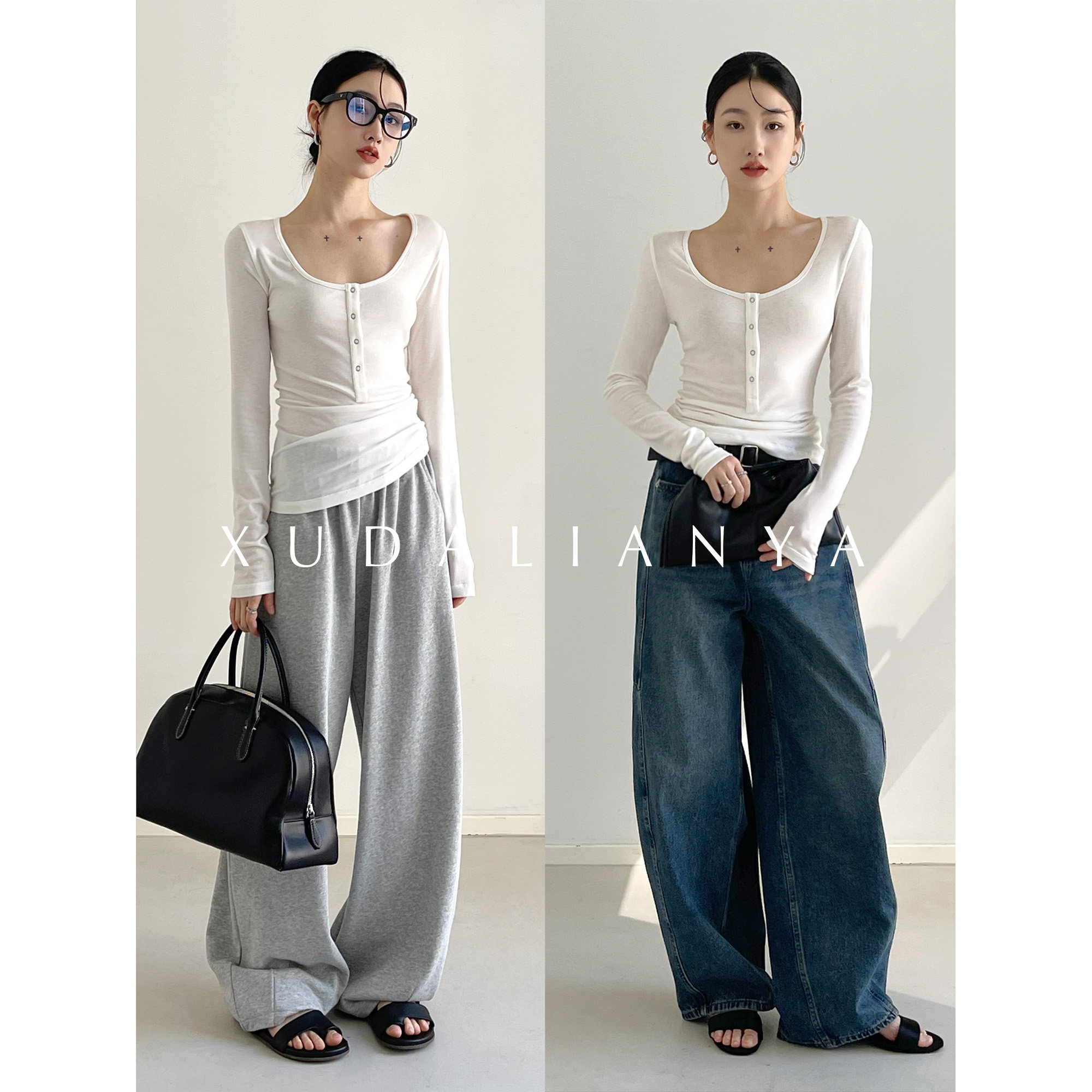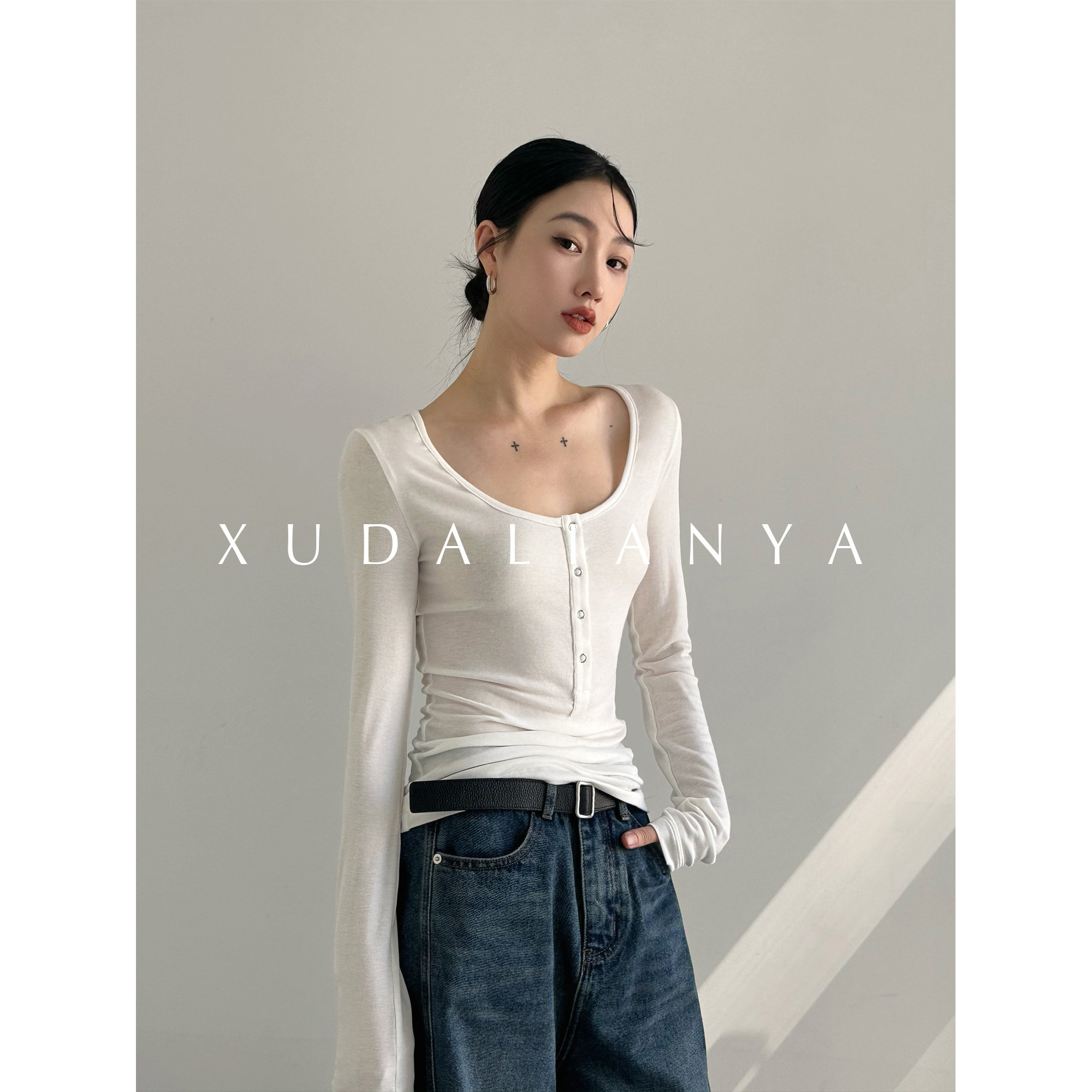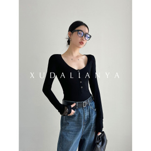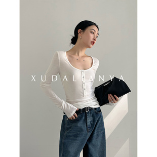 T恤女 上衣春秋U领长袖 徐大脸吖定制 肯豆t正肩显瘦内搭外穿打底衫