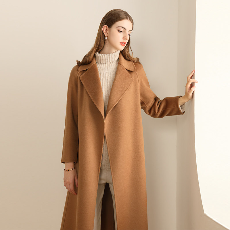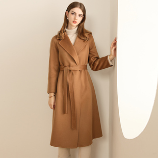 贝源M家明星同款 羊毛毛呢外套女 水波纹双面羊绒大衣女焦糖色长款