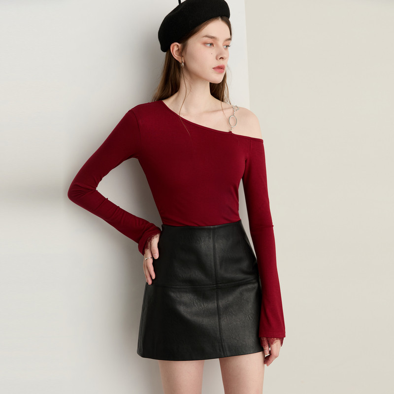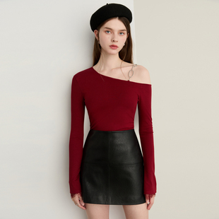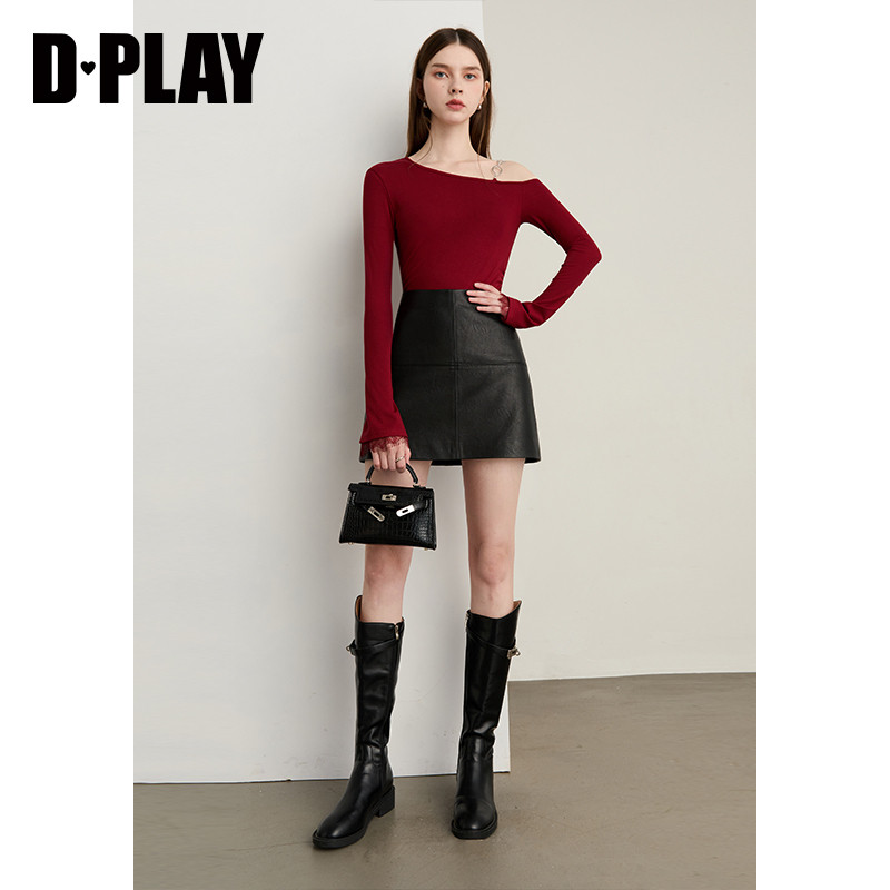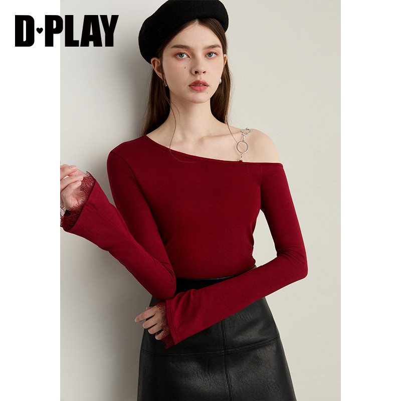 气质收腰小衫 DPLAY2025年秋季 流行时尚 红色上衣女斜肩喇叭袖 新款