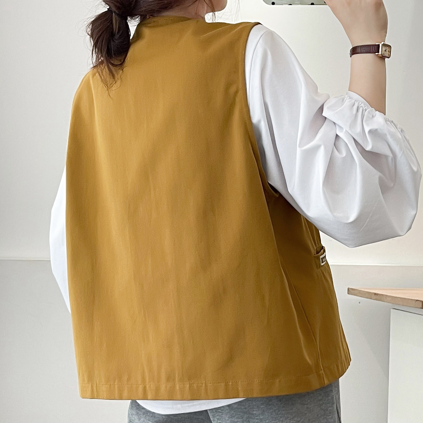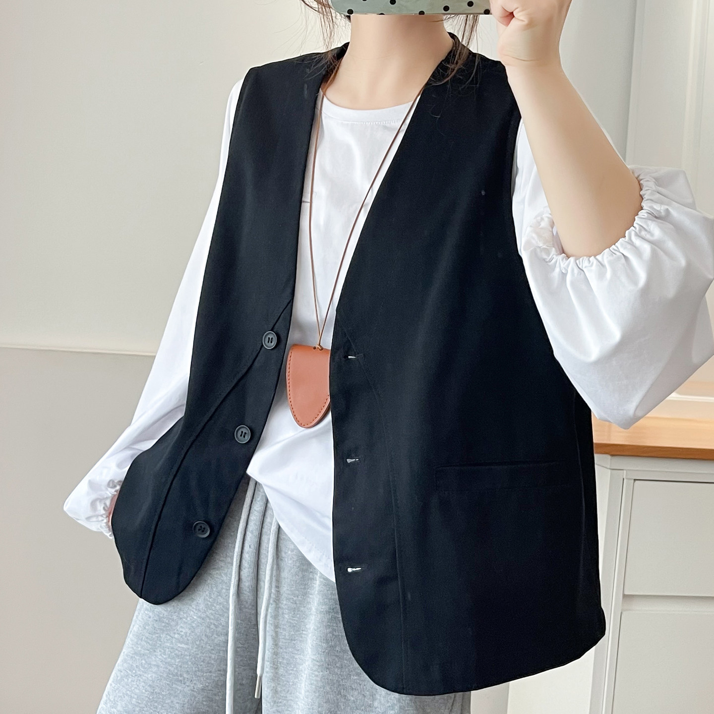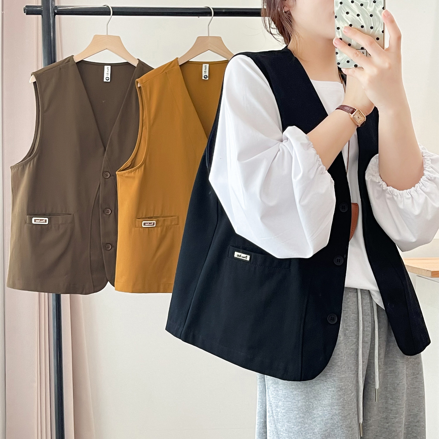 百搭工装 女装 马甲胖mm春季 大码 遮肉显瘦三粒扣坎肩上衣服 新款 时尚