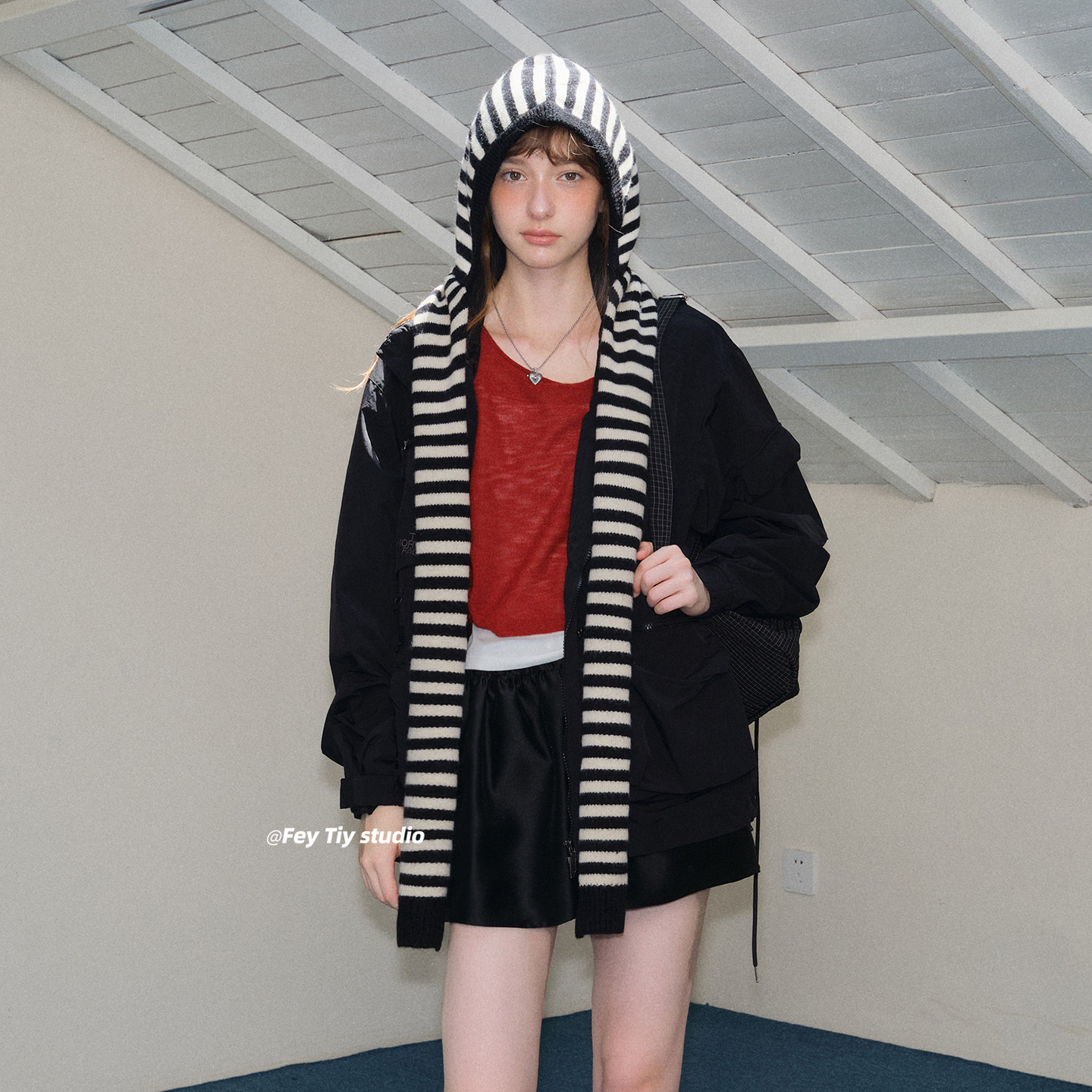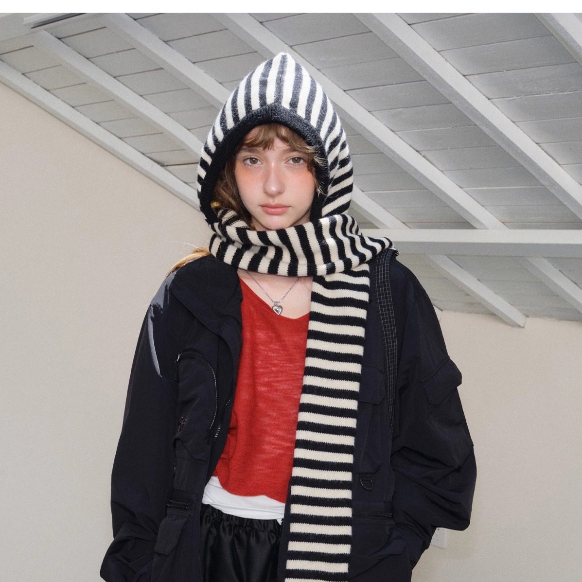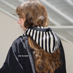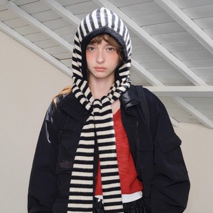 feytiy 复古时髦秋冬百搭保暖围巾帽子一体 黑白条纹巴拉克拉法帽