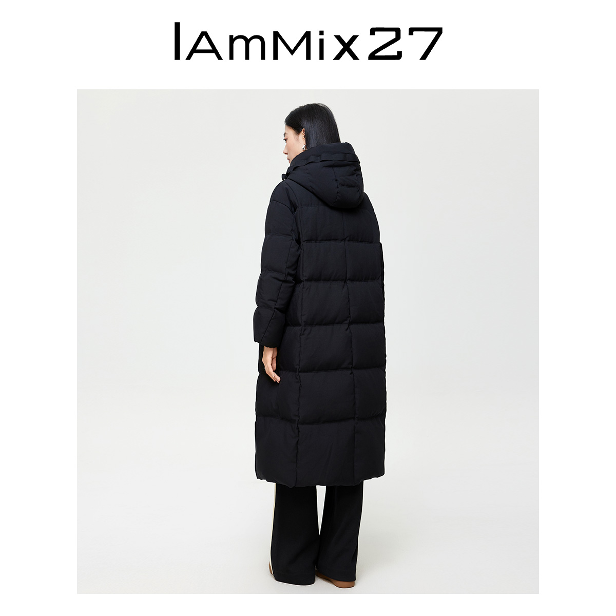 IAmMIX27冬季 过膝宽松加厚保暖90白鸭绒外套 黑色连帽羽绒服女长款