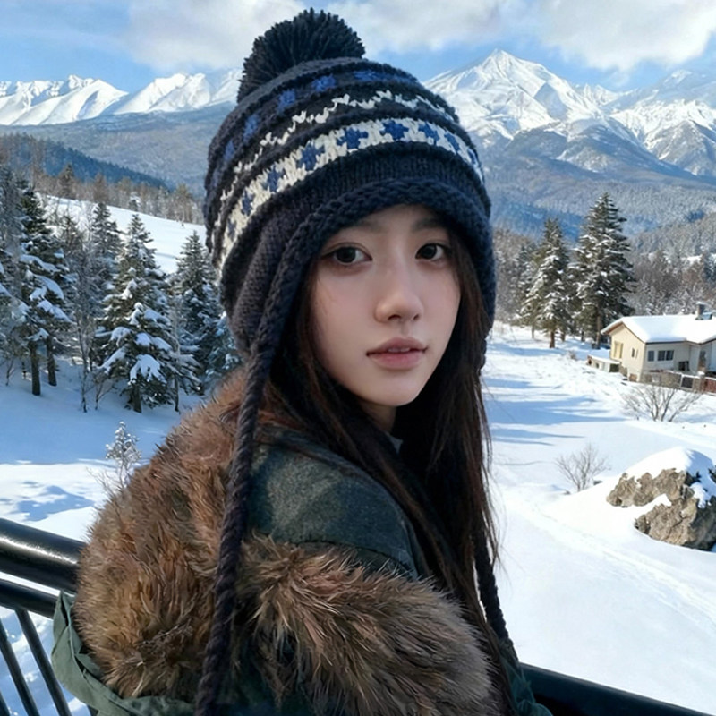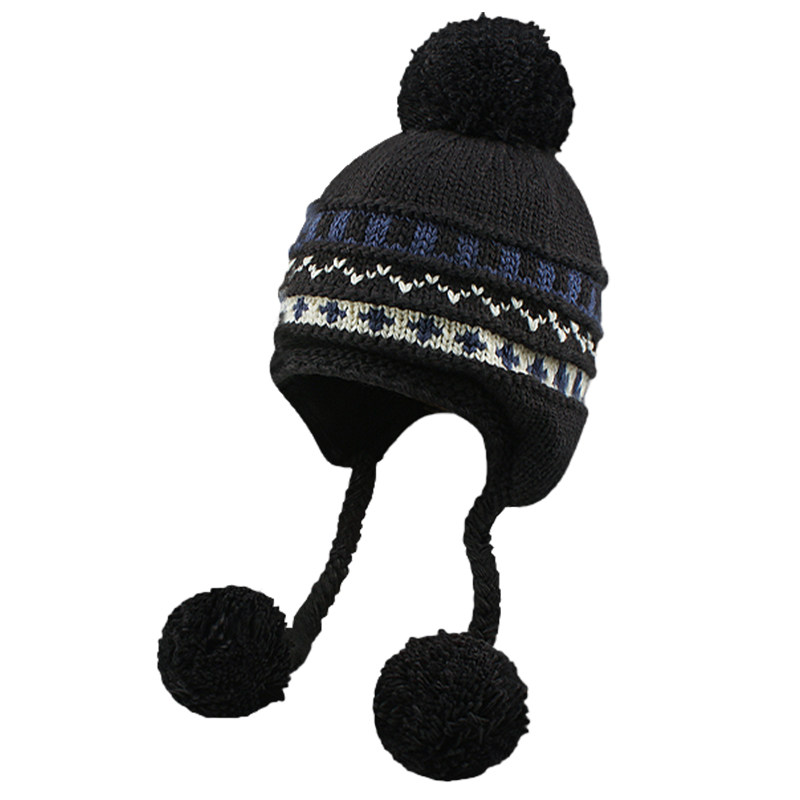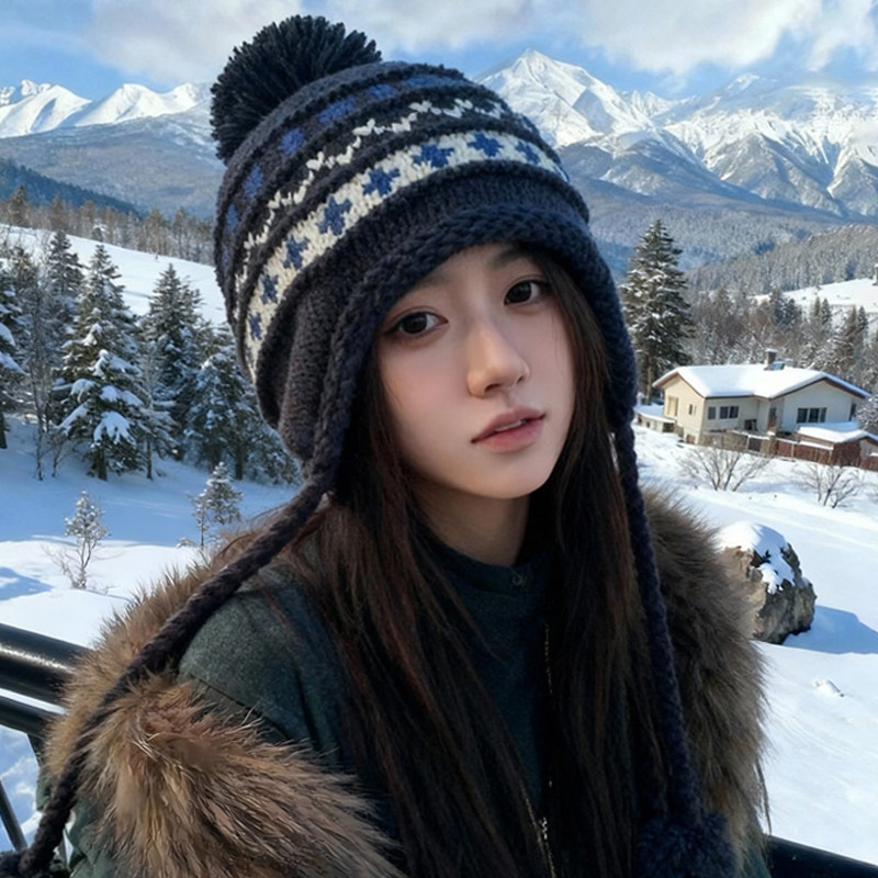 费尔岛提花毛球针织帽女秋冬保暖加绒毛线帽子骑车防寒护耳雷锋帽