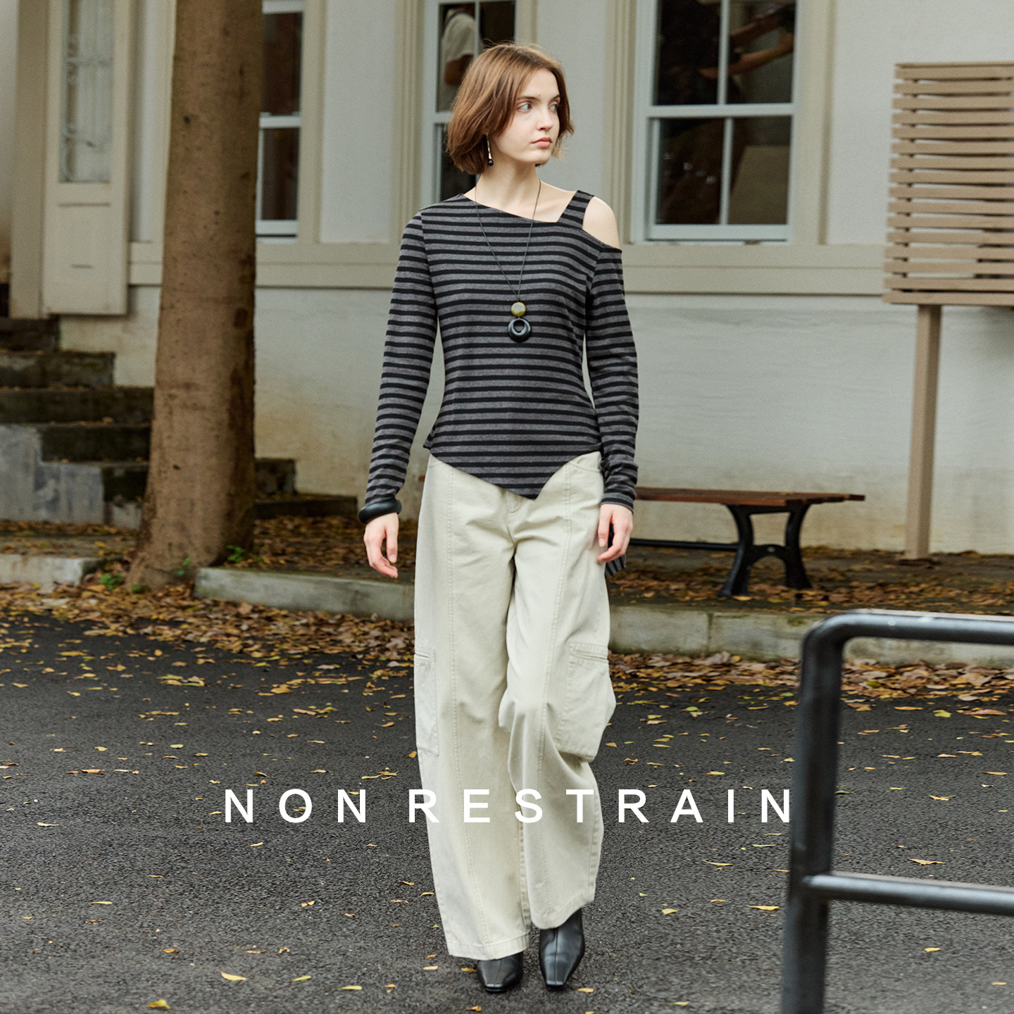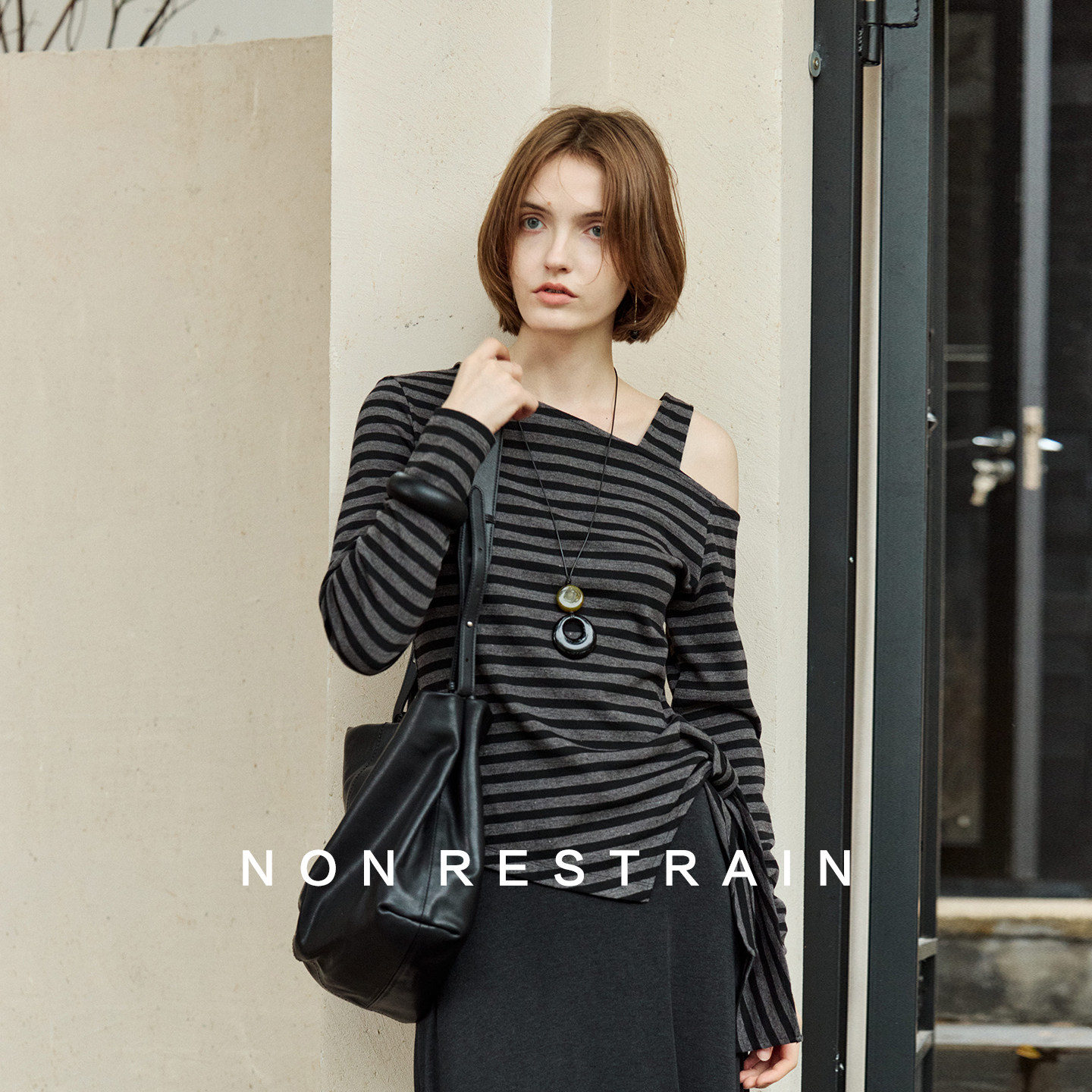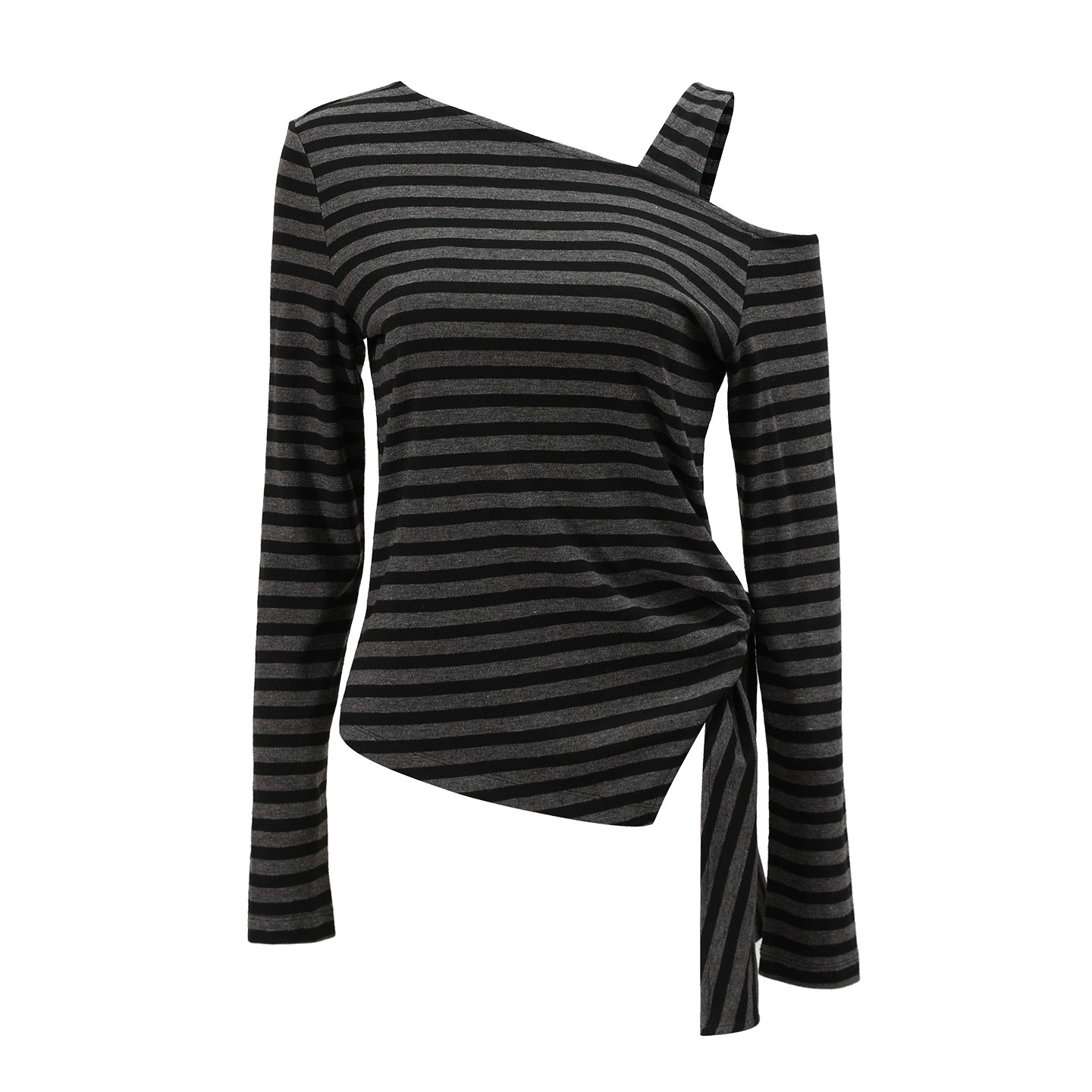 T恤 显瘦条纹斜肩长袖 NON RESTRAIN不规则绑带收腰露肩上衣女修身