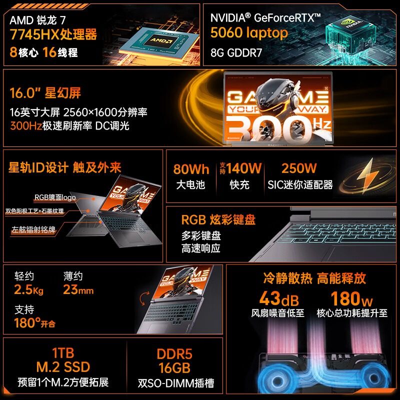 RTX5060独显锐龙R7 16英寸电竞本游戏本大学生笔记本家用电脑2025新款 7745HX 300Hz 187 2.5K 机械师曙光16S