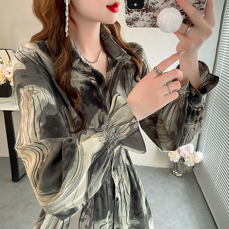 衬衣时尚 灰色遮屁股衬衫 喇叭袖 2025新款 印花显瘦松紧腰上衣秋 女款
