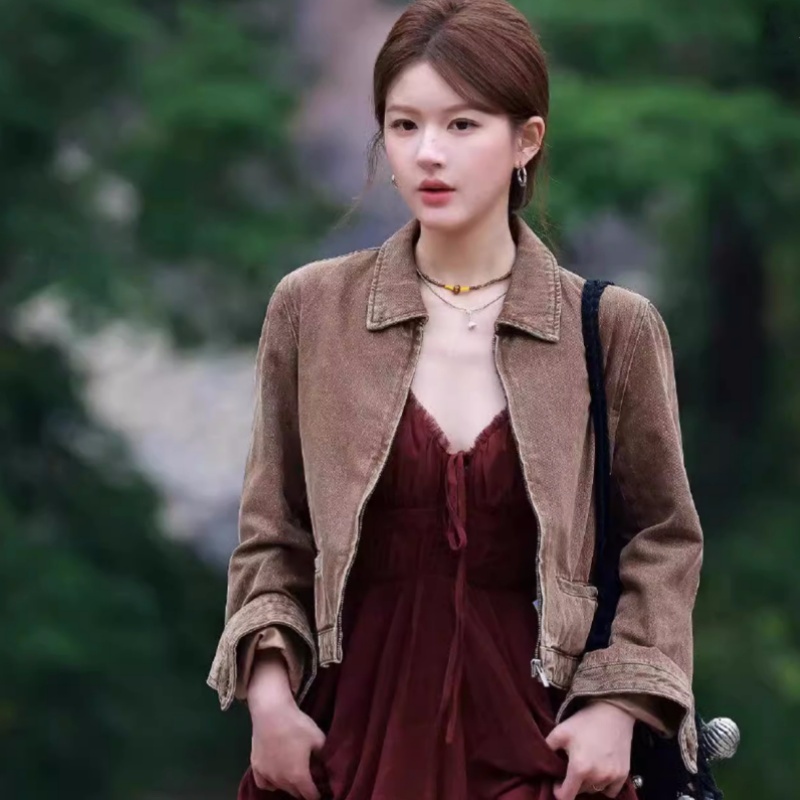 赵露思明星同款 牛仔外套百搭显瘦上衣潮 棕色洗水做旧复古简约长袖