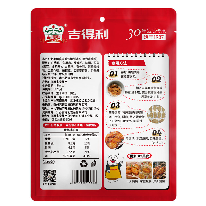 吉得利新奥尔良下酒菜麻辣腌料小包烧烤鸡翅家用30g烤肉调料烤翅