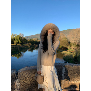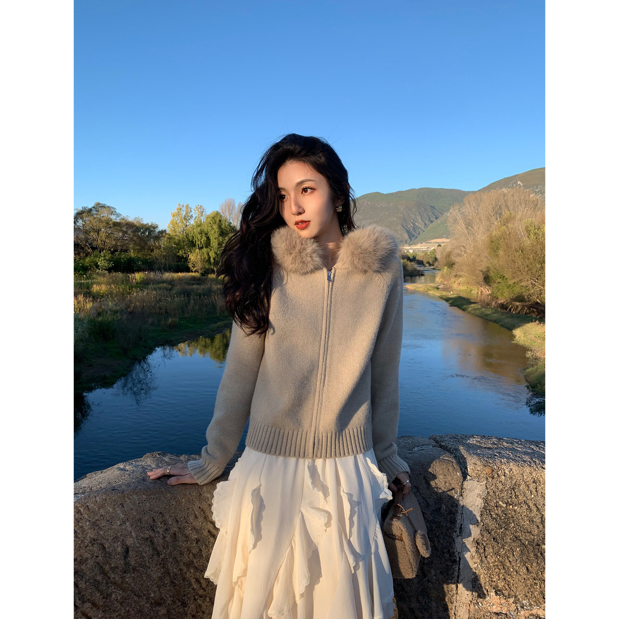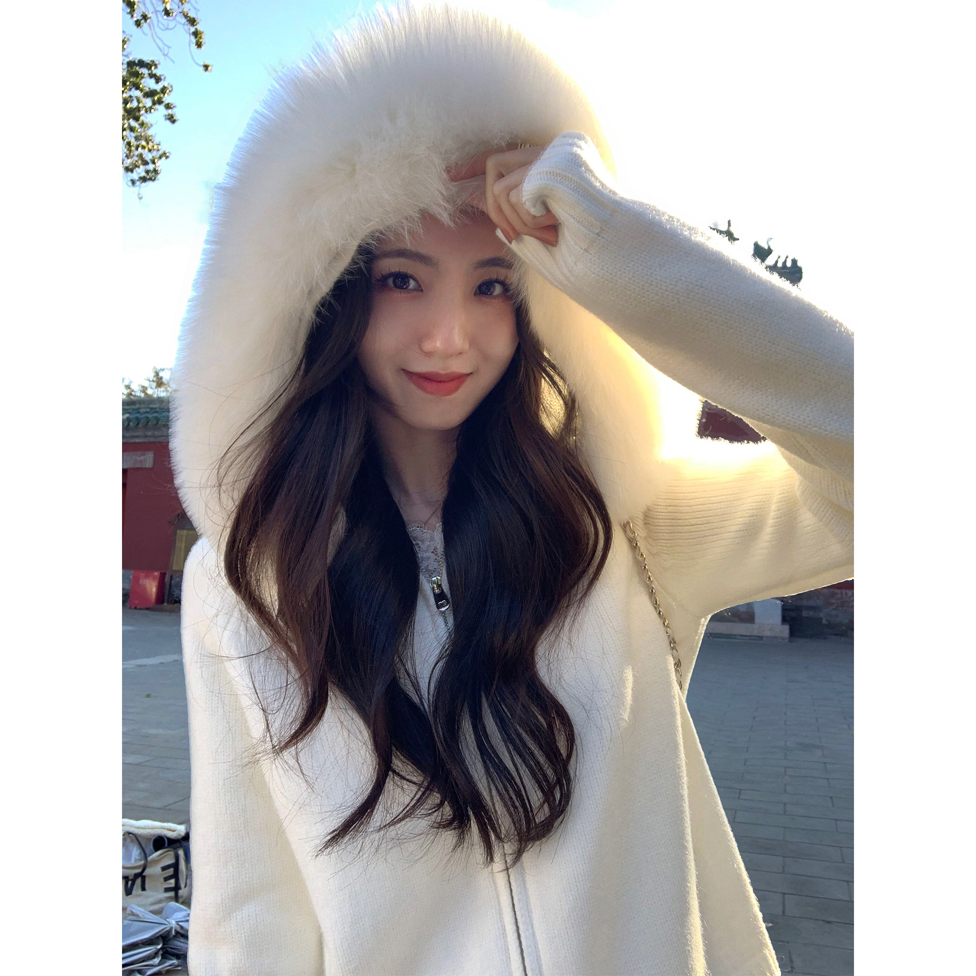 拉链针织开衫 可拆大毛领连帽毛衣外套女休闲短款 暮霭云团 MULVAN