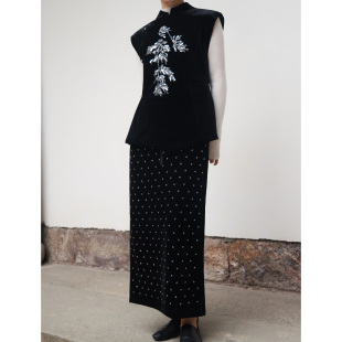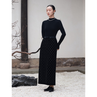 小鹿弥雅 系列原创钉珠丝绒直筒后开叉半身裙秋冬 繁星