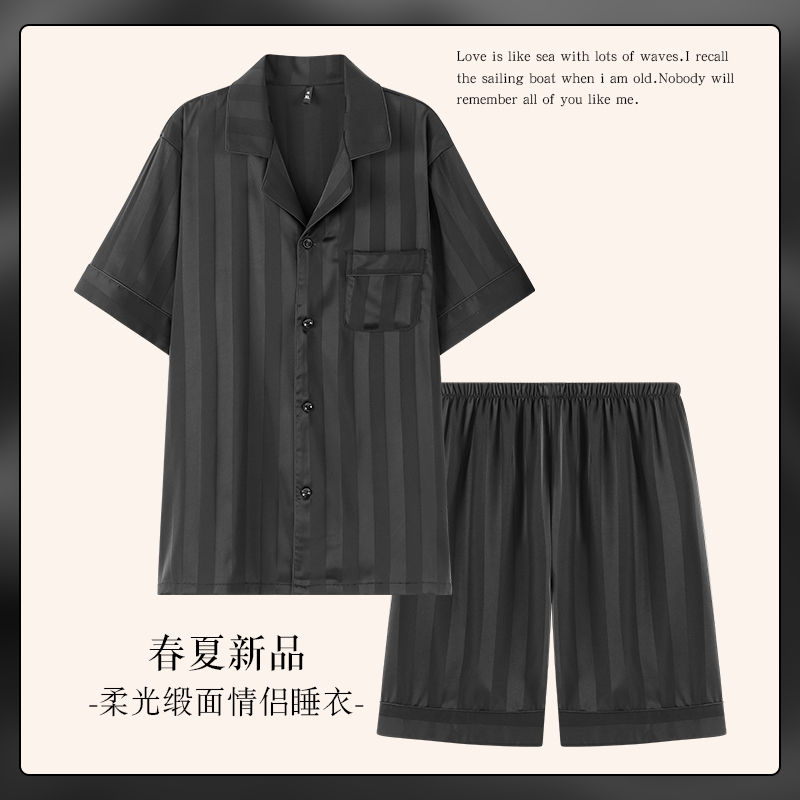 高级感家居服夏天条纹黑色套装 短裤 短袖 冰丝情侣睡衣一男一女夏季