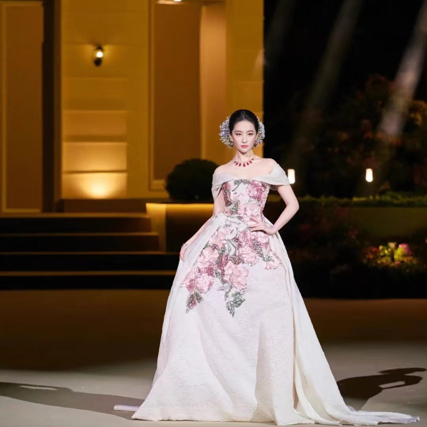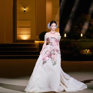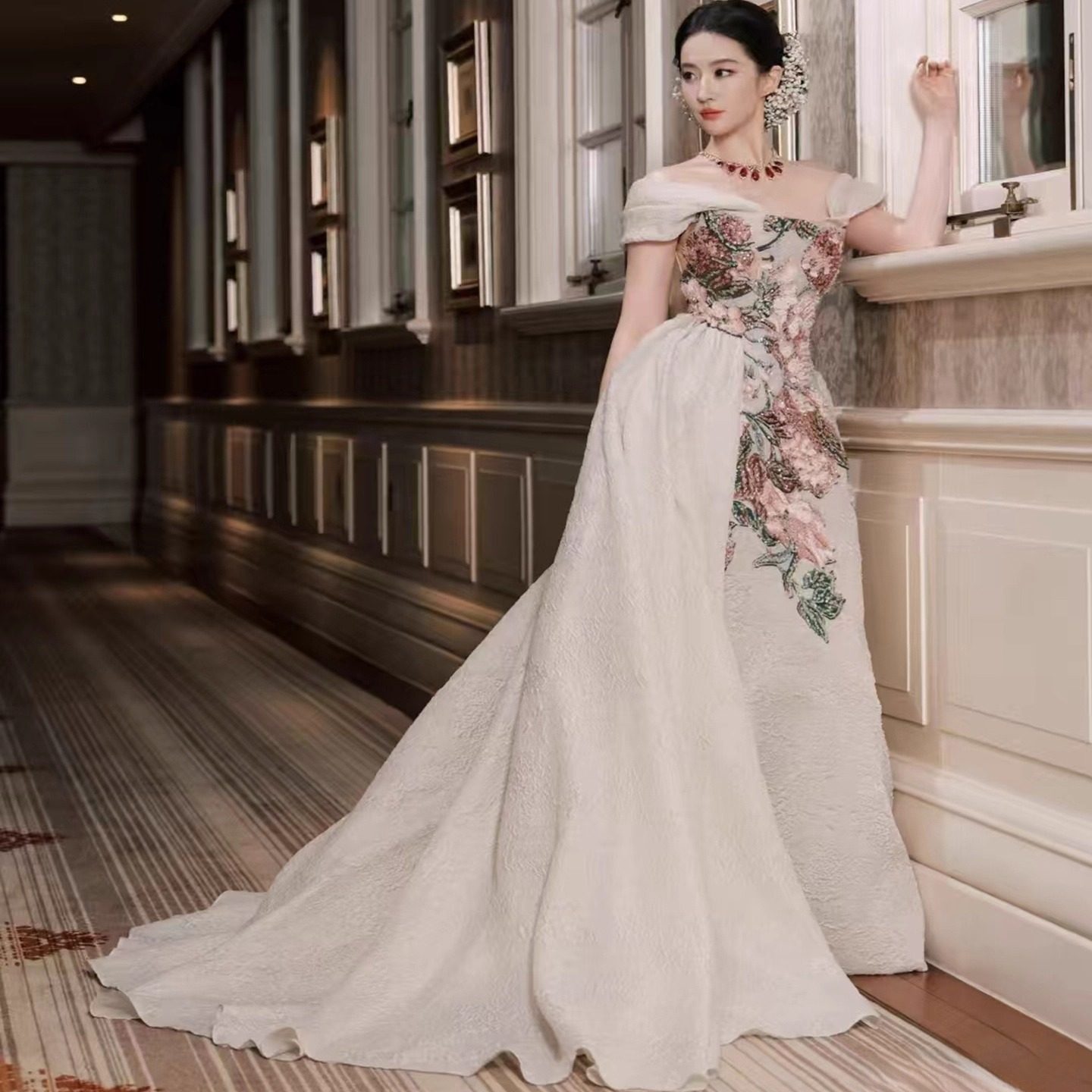 晚礼服明星同款 2025白色提花公司宴会结婚订婚高端舞台一字肩蓬裙
