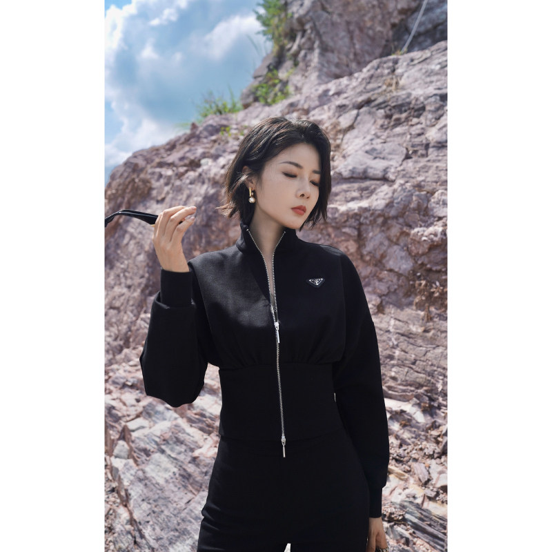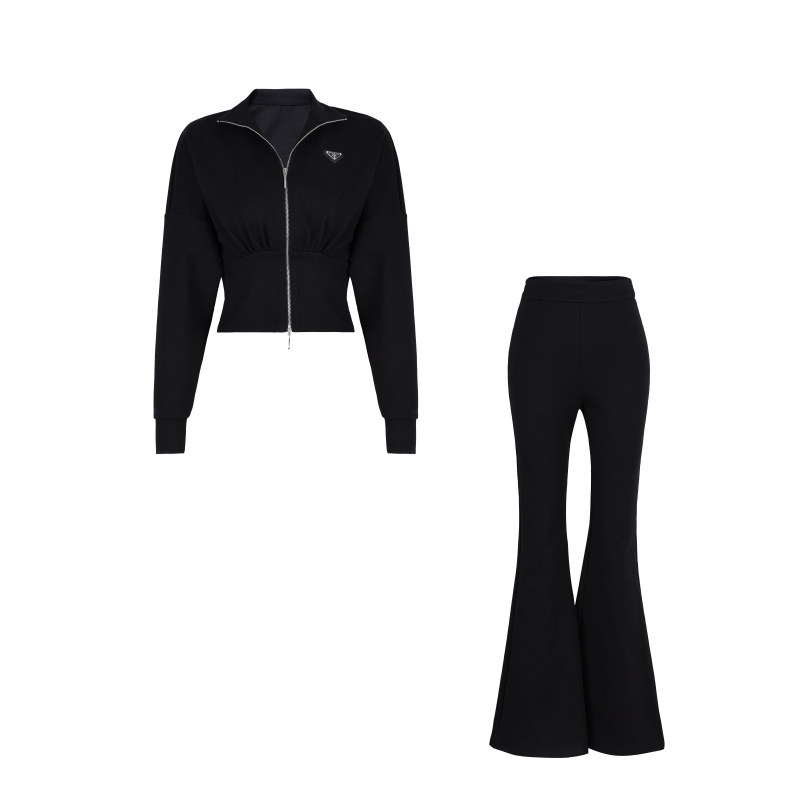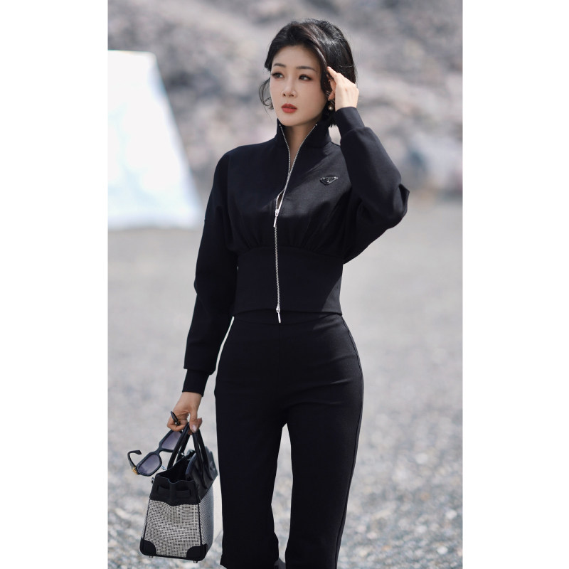 两件套装 XULU原创秋季 小外套高弹微喇长裤 立领拉链短款 罗马纹美式