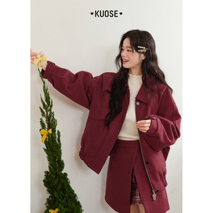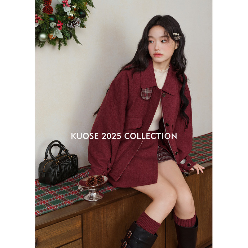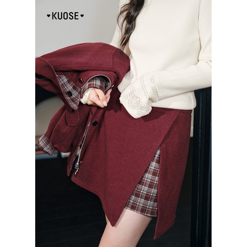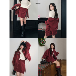阔色红色格子外套两件套装 新年穿搭半身裙女上衣短裙子 2025秋冬季