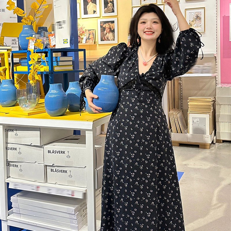 连衣裙女春季 大码 复古v领碎花长袖 法式 休闲收腰显瘦茶歇长裙 时尚