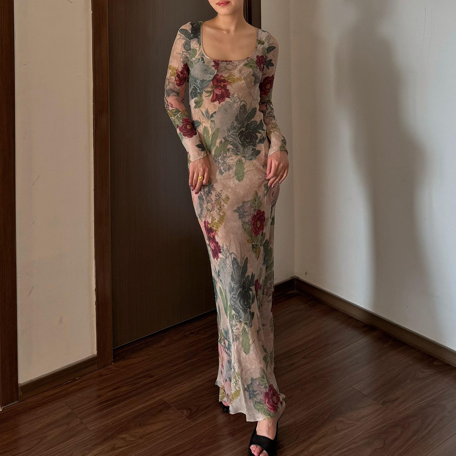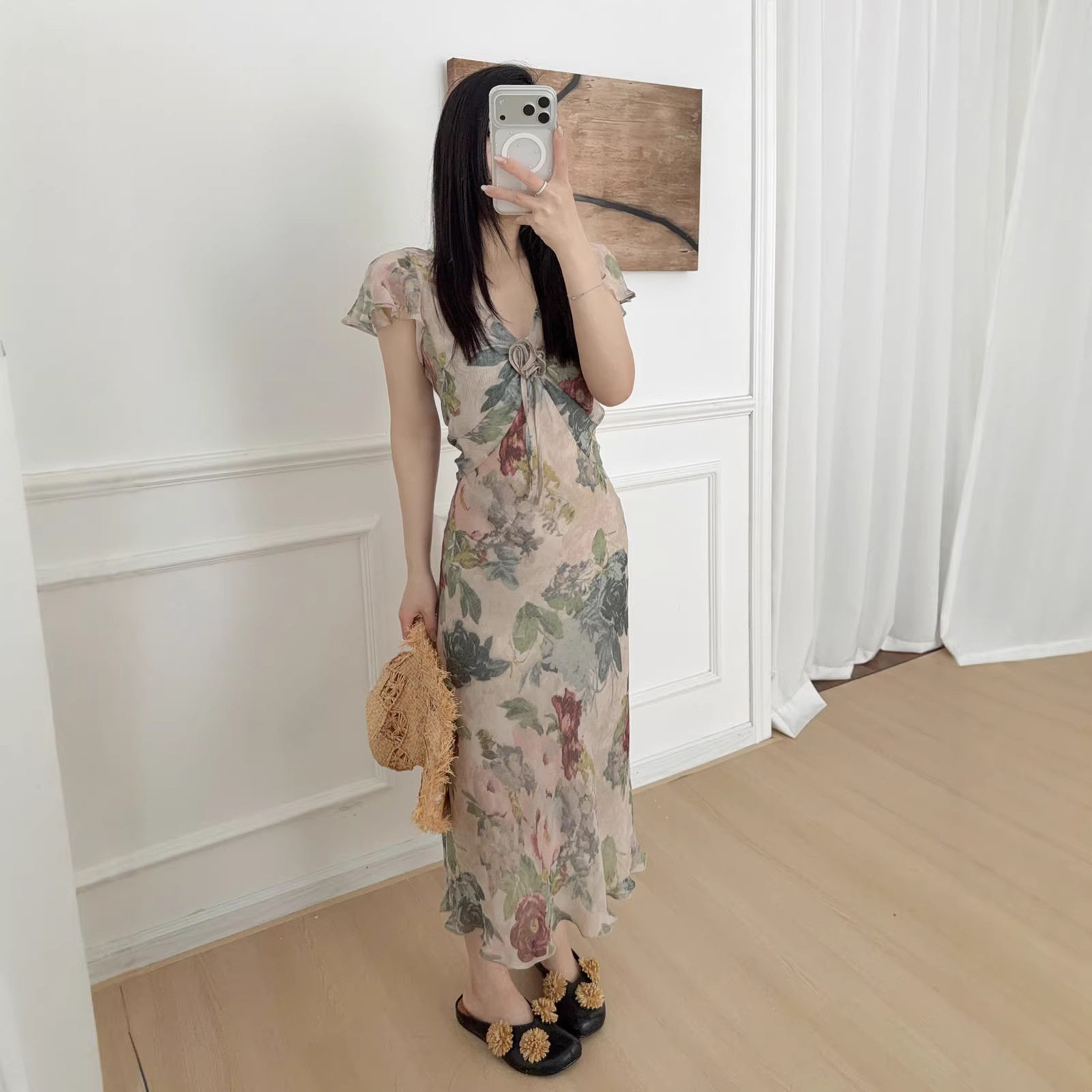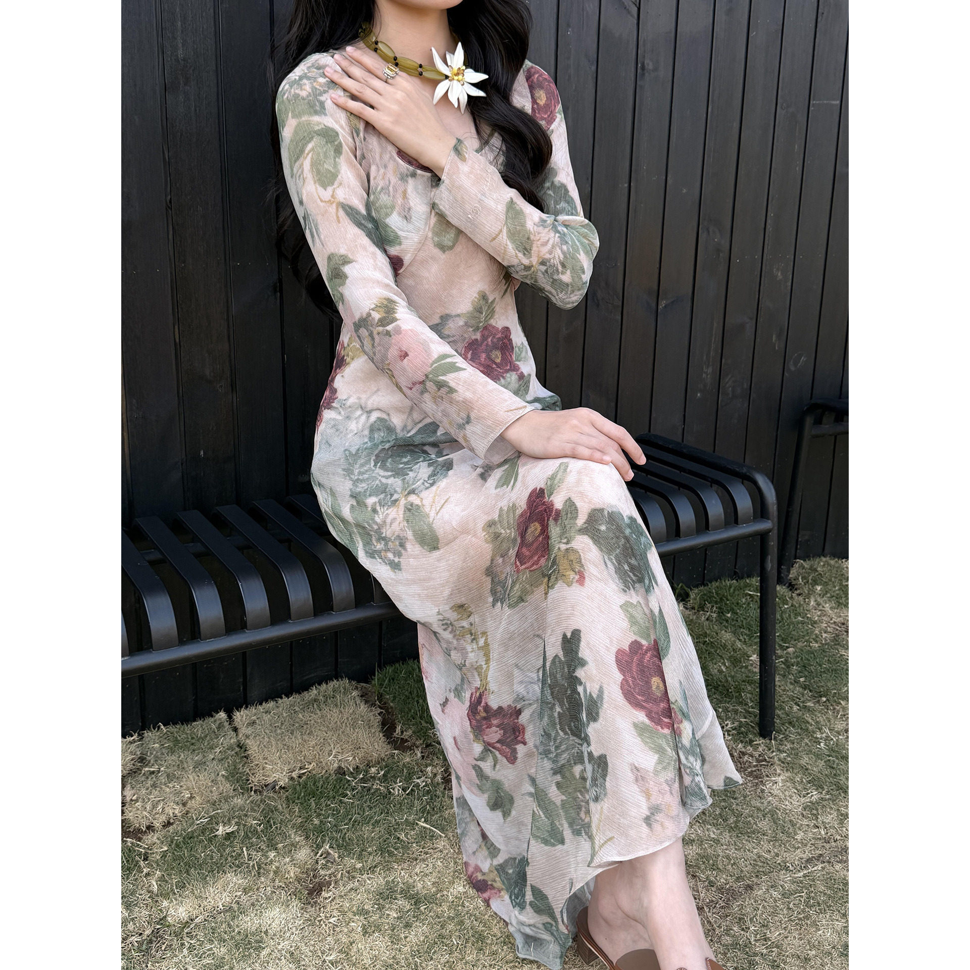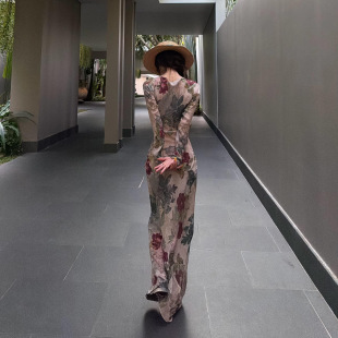 印花连衣裙女两件套长裙 修身 26夏深V斜裁款 连衣裙波西米亚风长袖