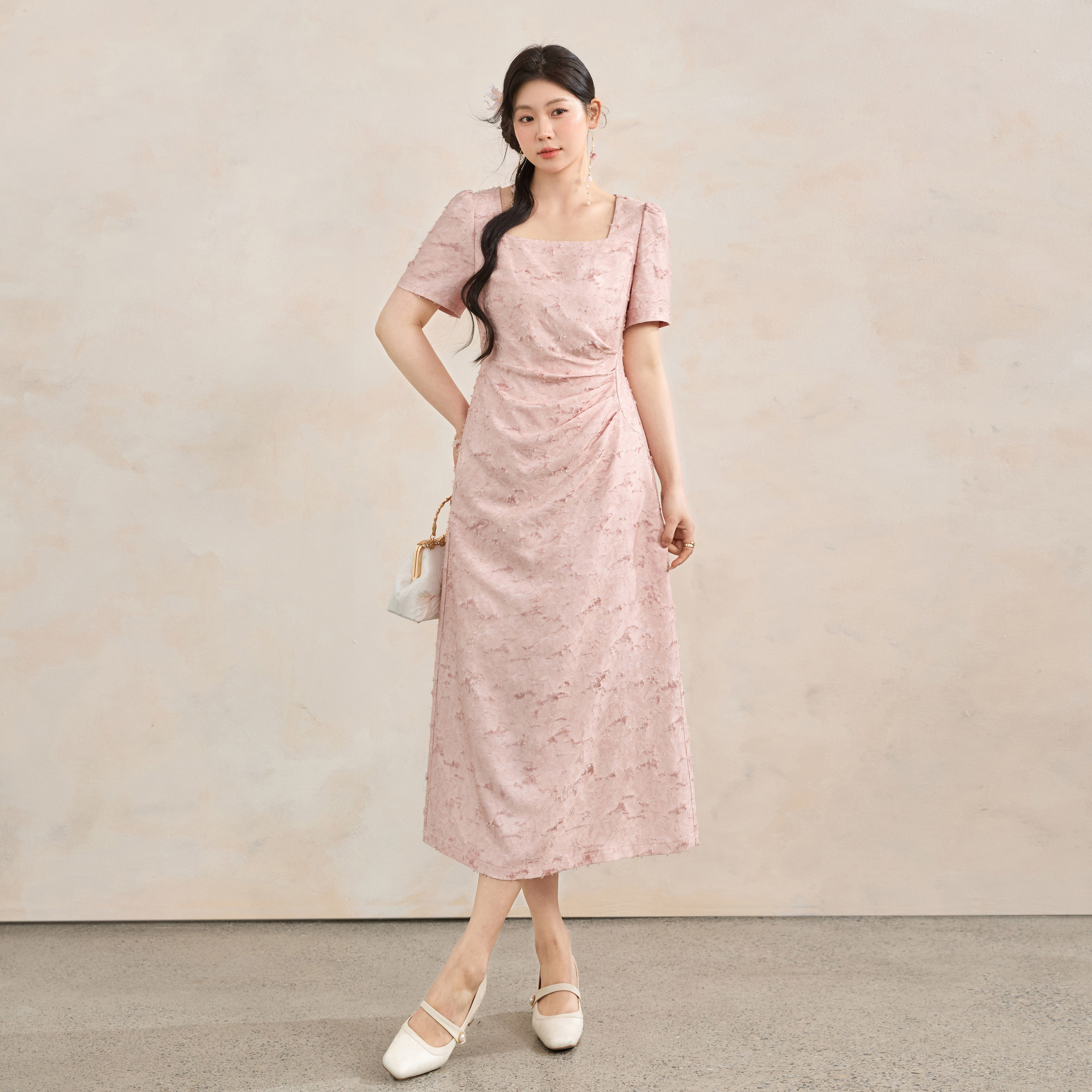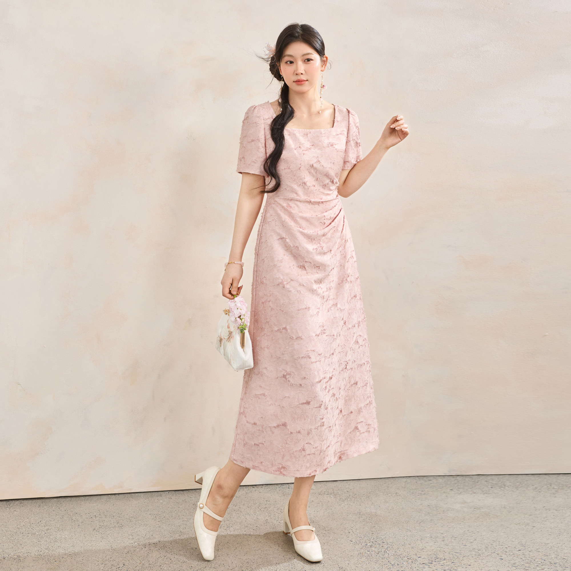 蓝语大码 会员限时6折 轻国风粉色收腰捏褶方领连衣裙 3.27新品