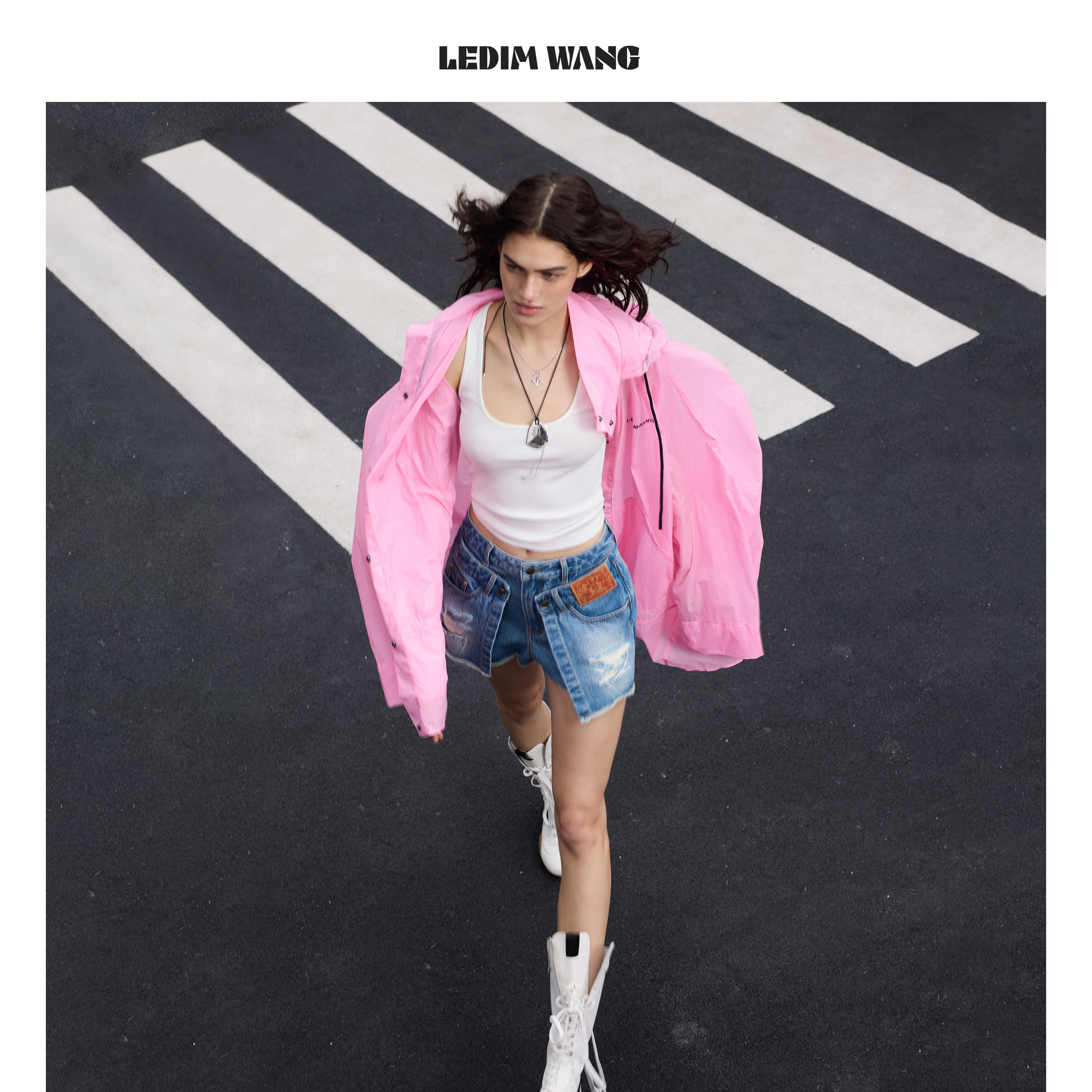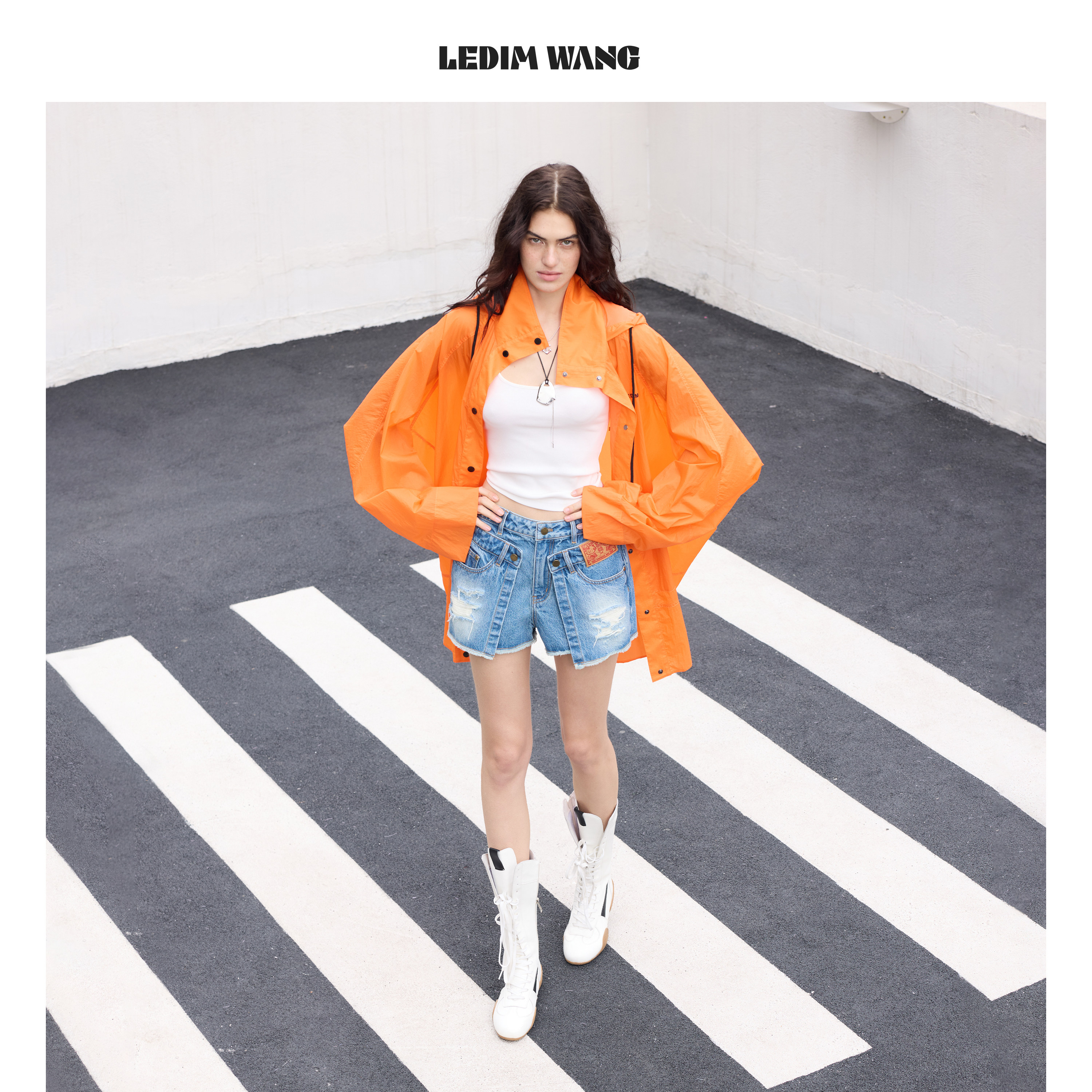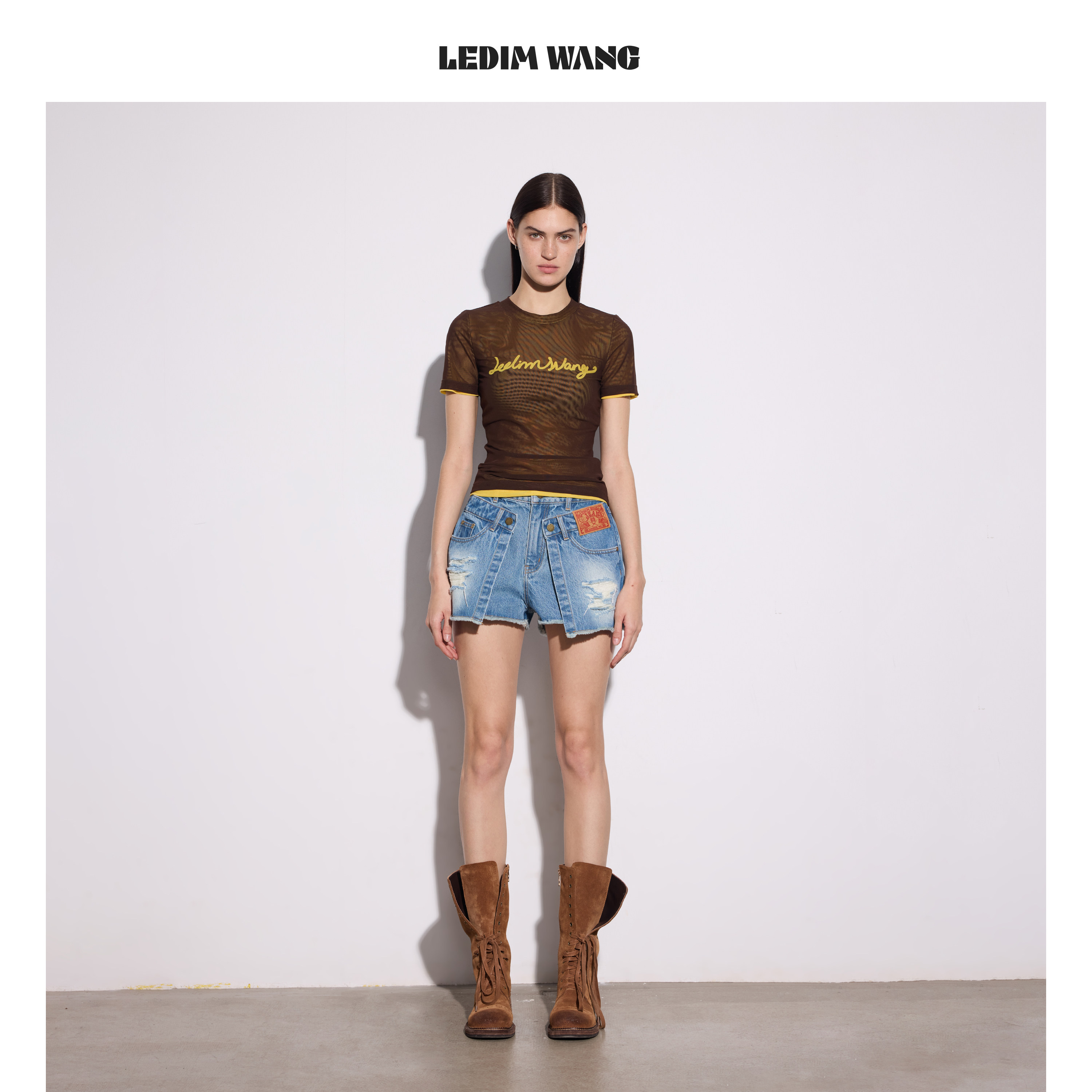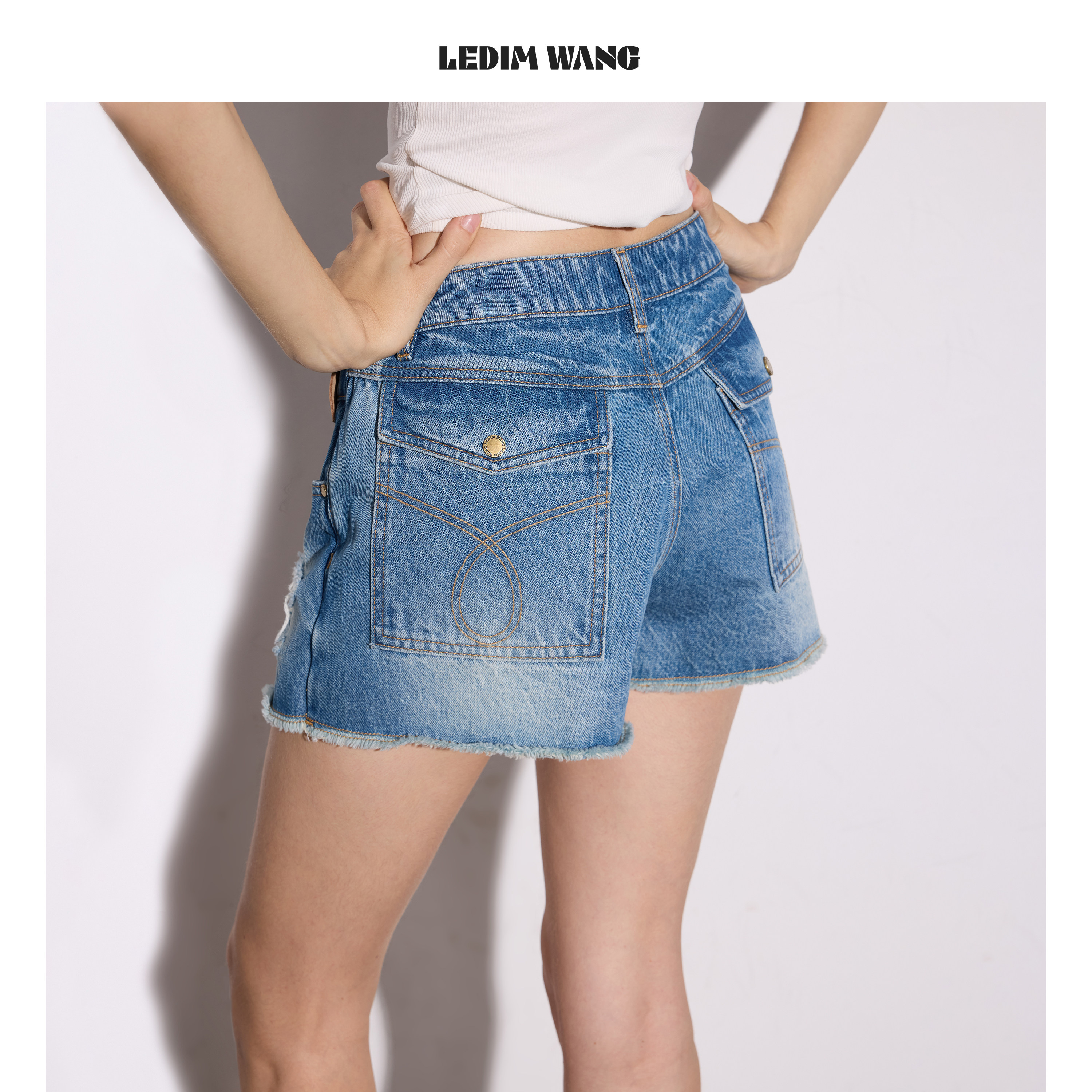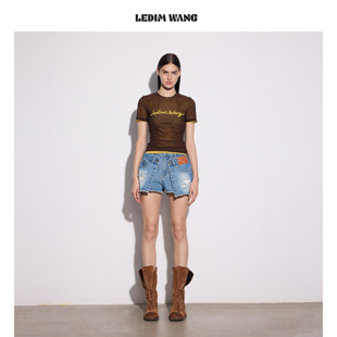 2026春夏新款 女牛仔蓝做旧A型中腰短裤 WANG搭片破洞牛仔裤 LEDIM