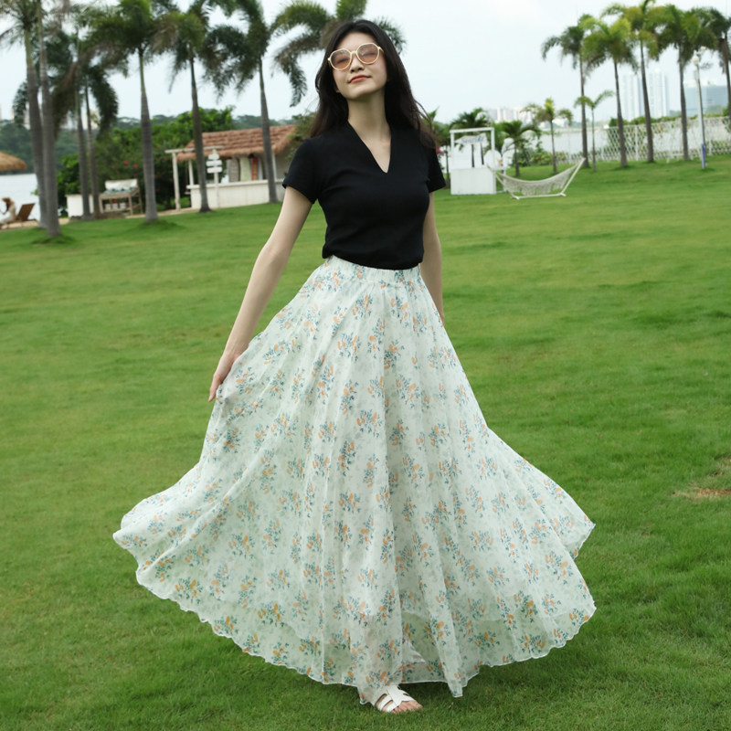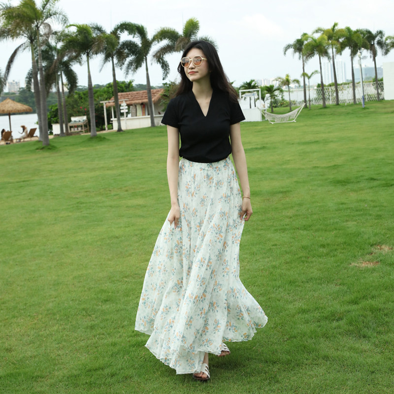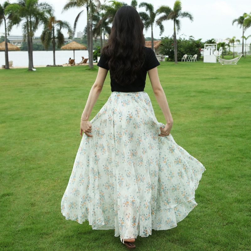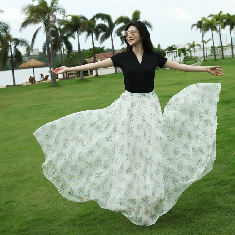 小清新大摆长裙小碎花半身裙夏女雪纺裙波西米亚沙滩裙裙子