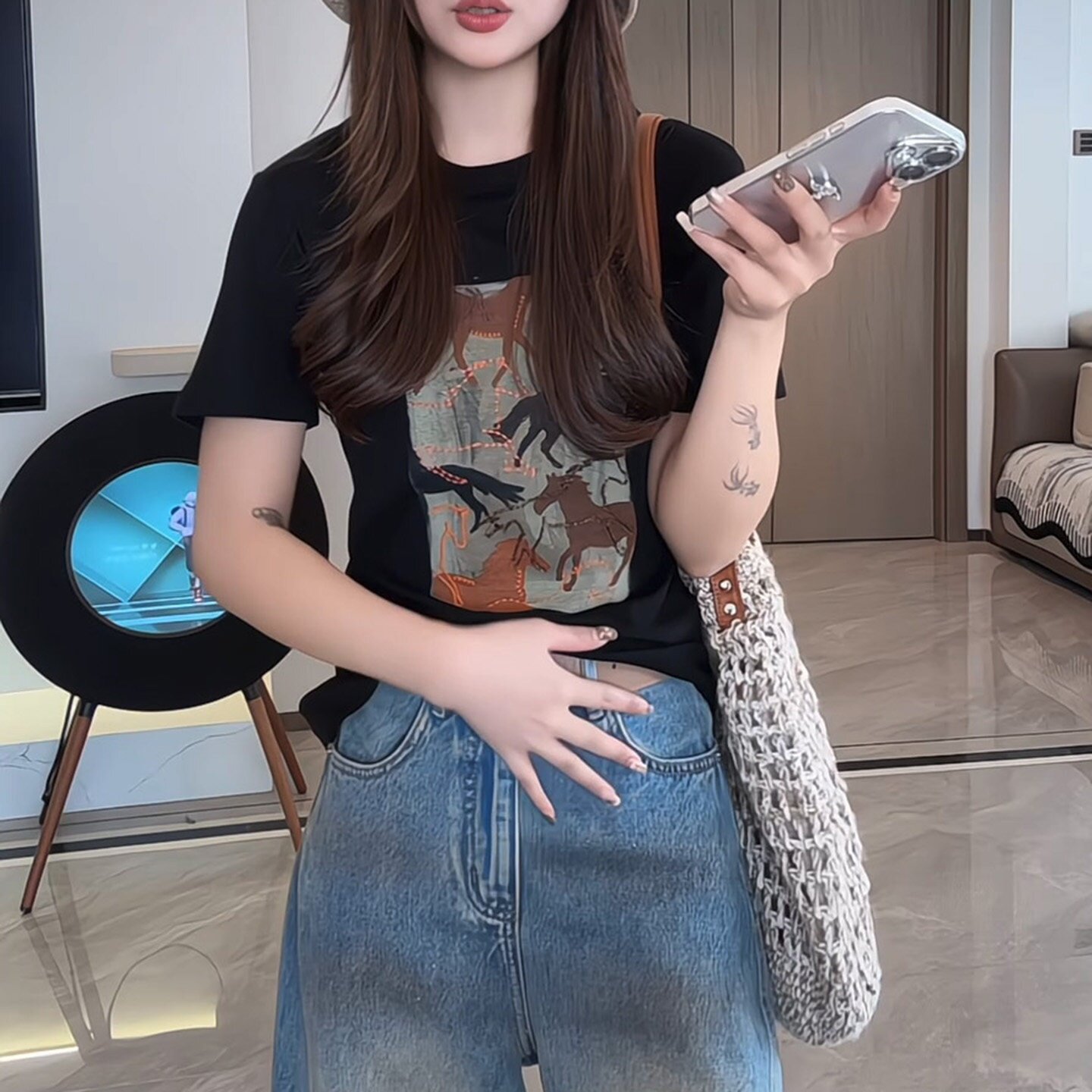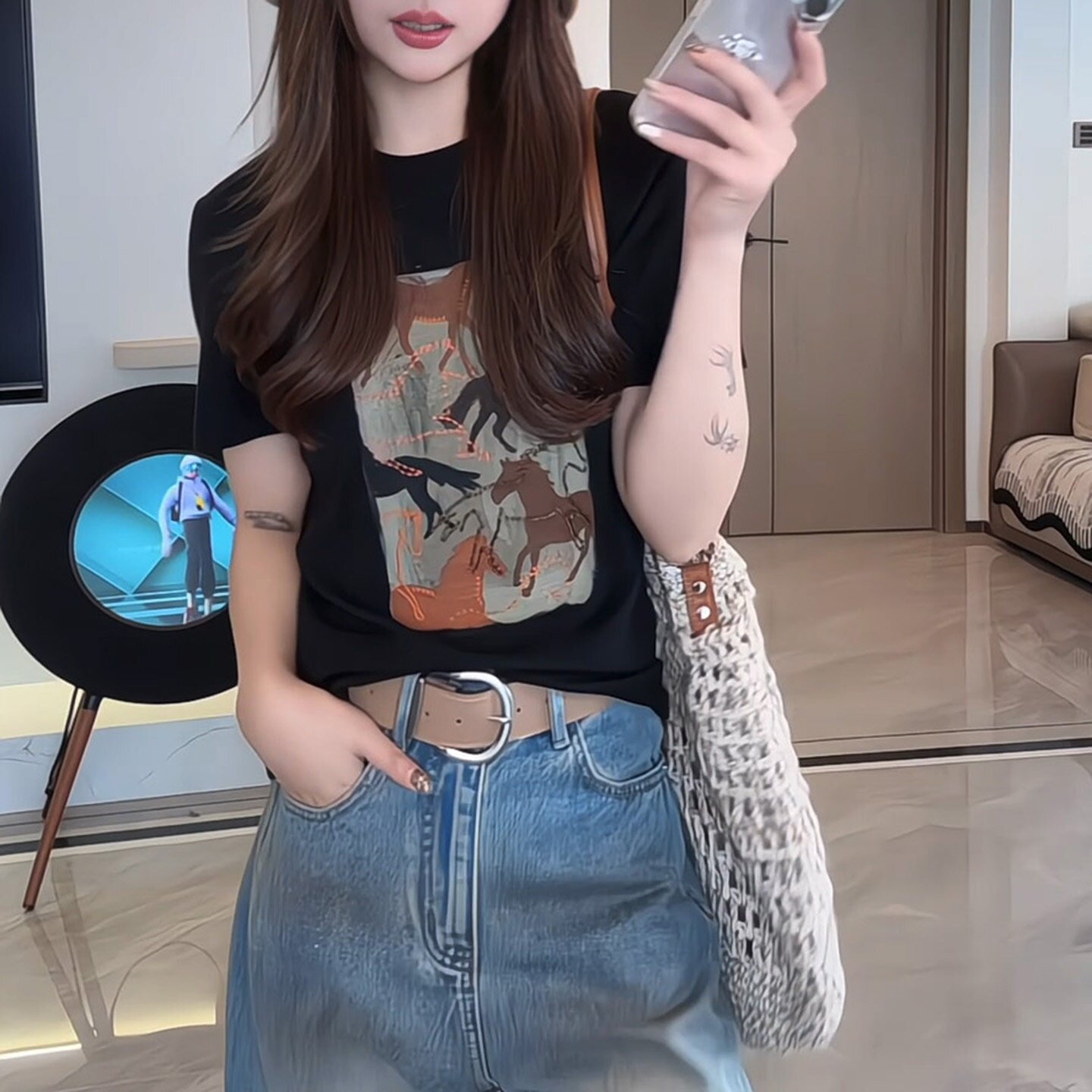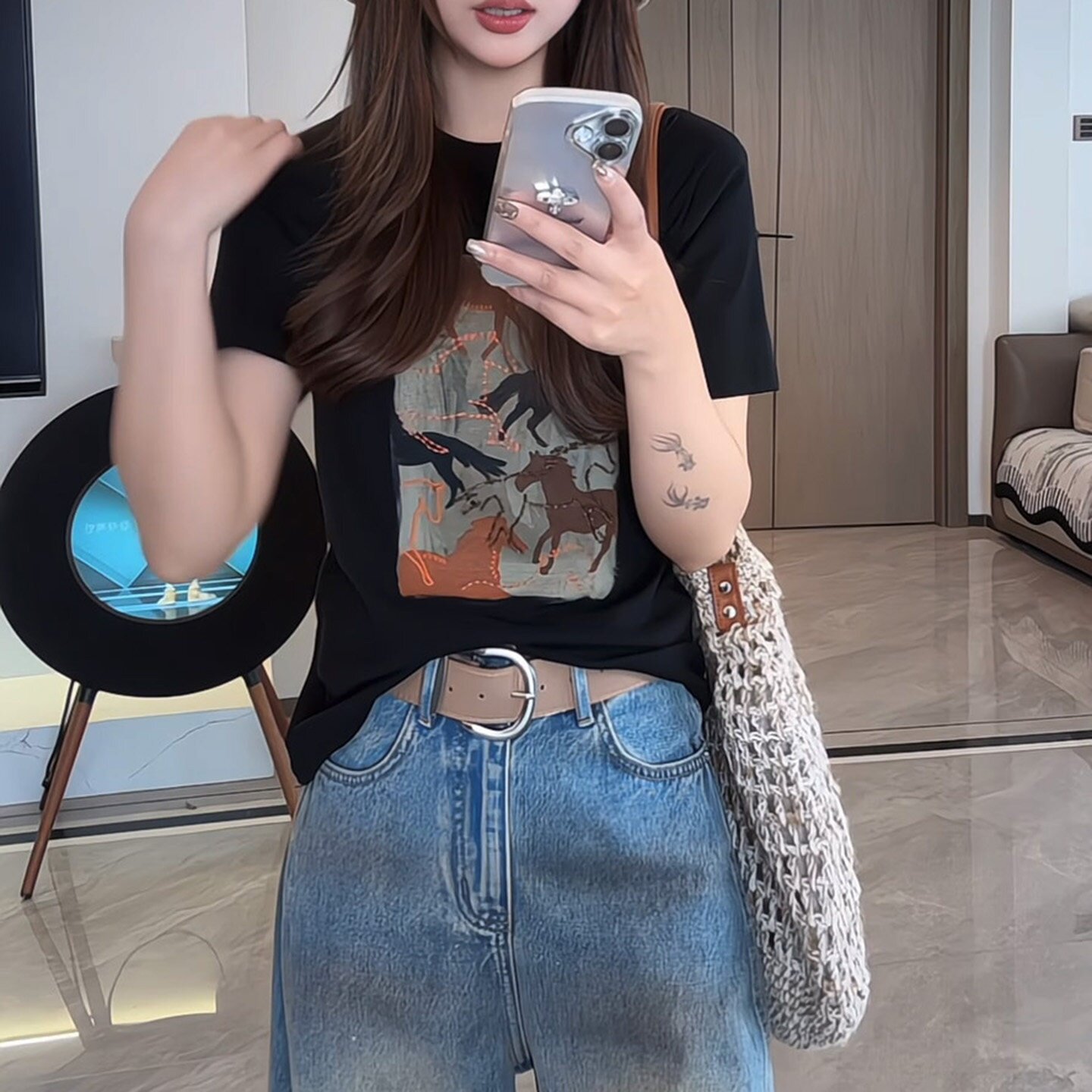 女装 百搭休闲显瘦上衣大码 内搭 T恤女春时尚 重工小马图案圆领短袖