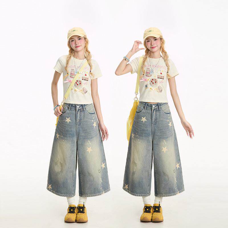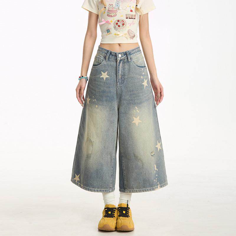 女做旧水洗宽松阔腿休闲七分裤 NERESUM美式 复古星星印花牛仔短裤