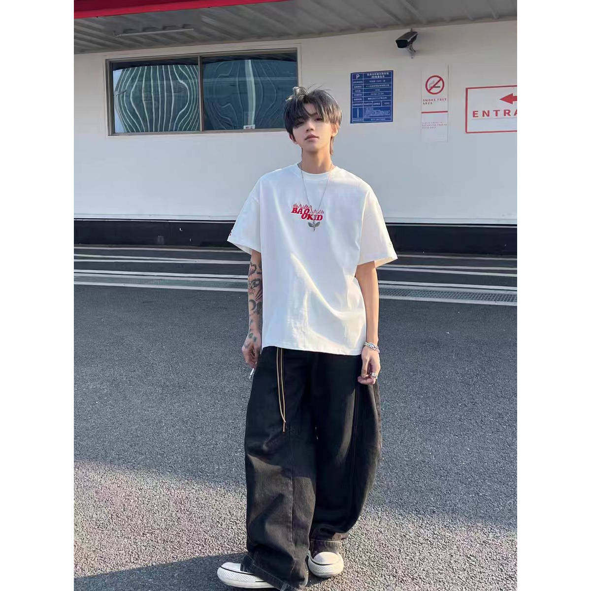 情侣宽松半袖 T恤男女夏季 tee 小火苗刺绣字母纯棉100%短袖 国潮美式