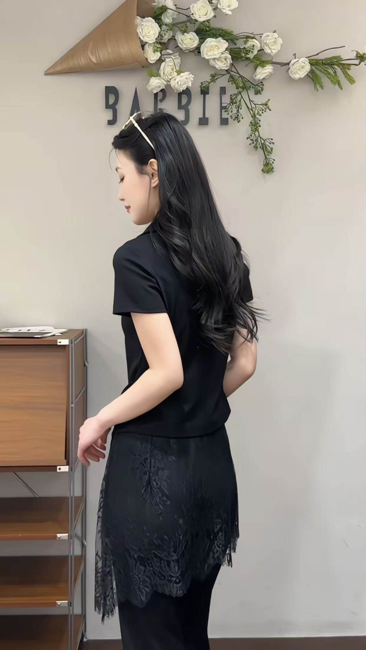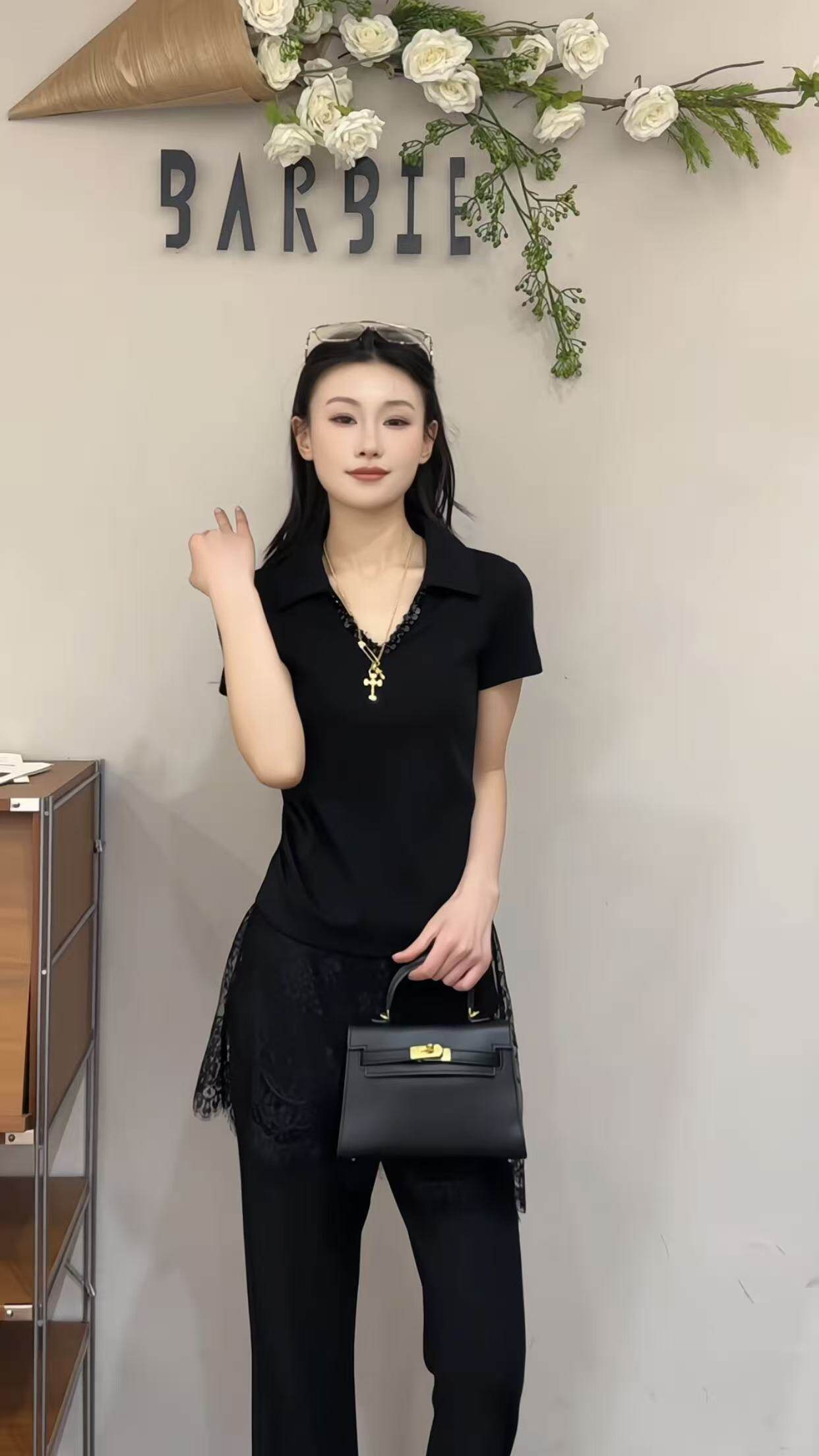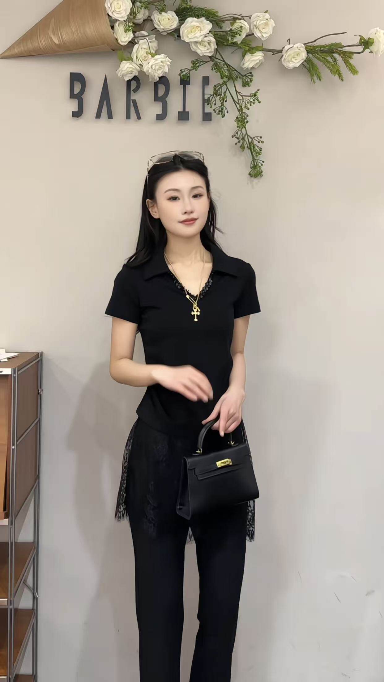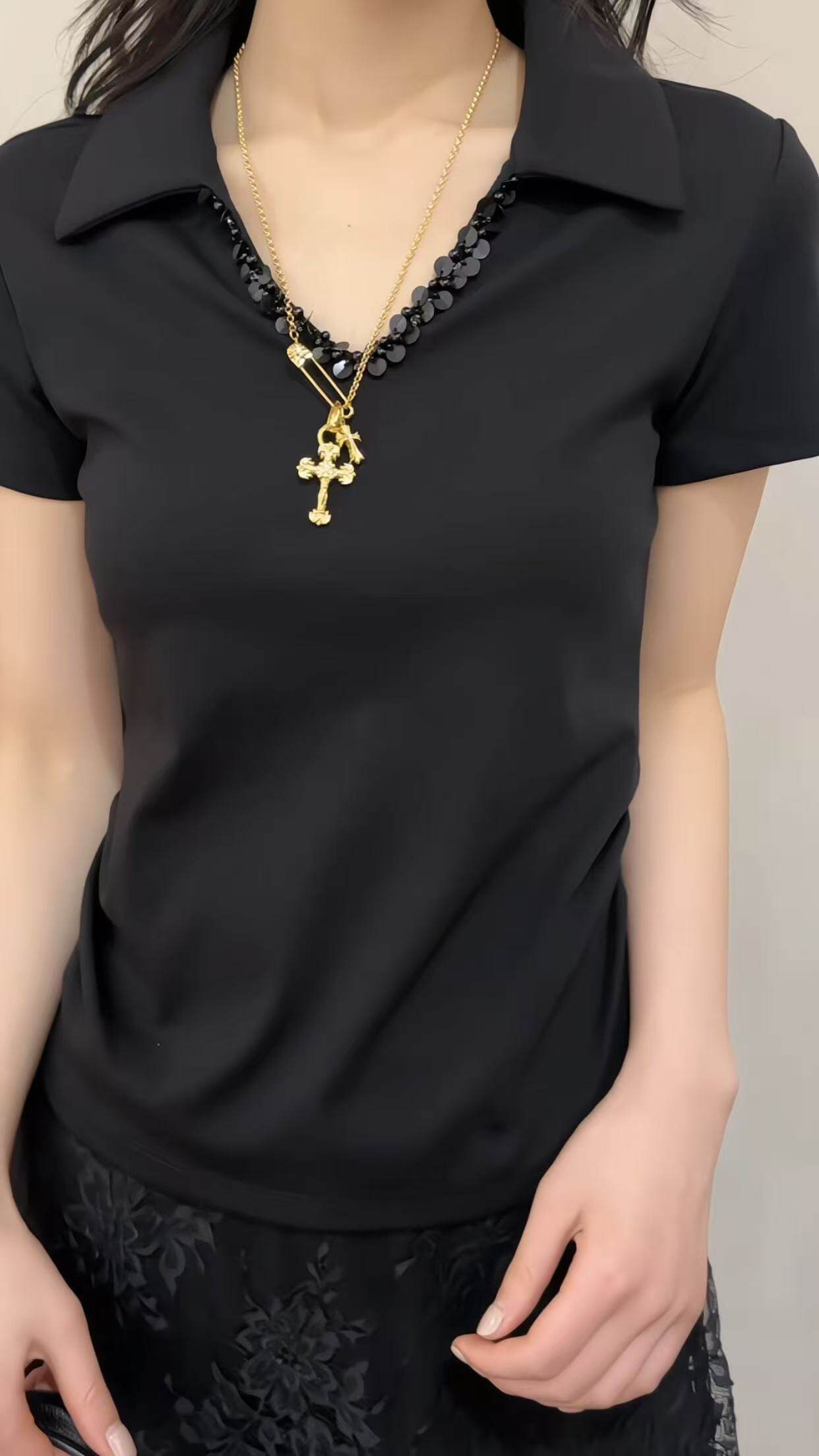 上衣35533 正肩短袖 欧洲站2026新款 欧货气质钉珠亮片鸡心领修身