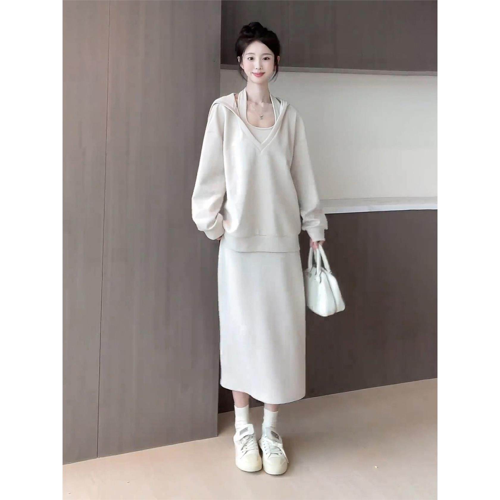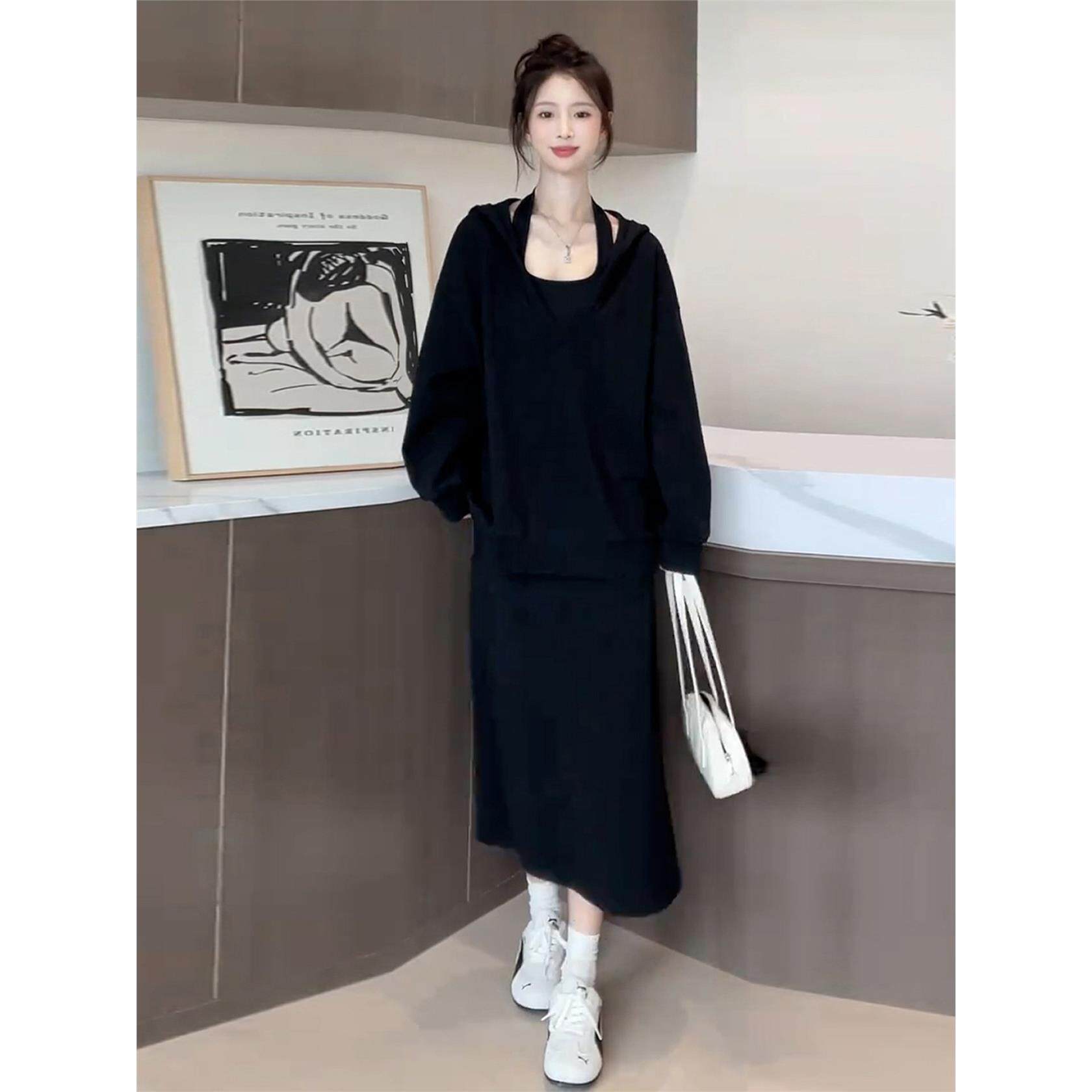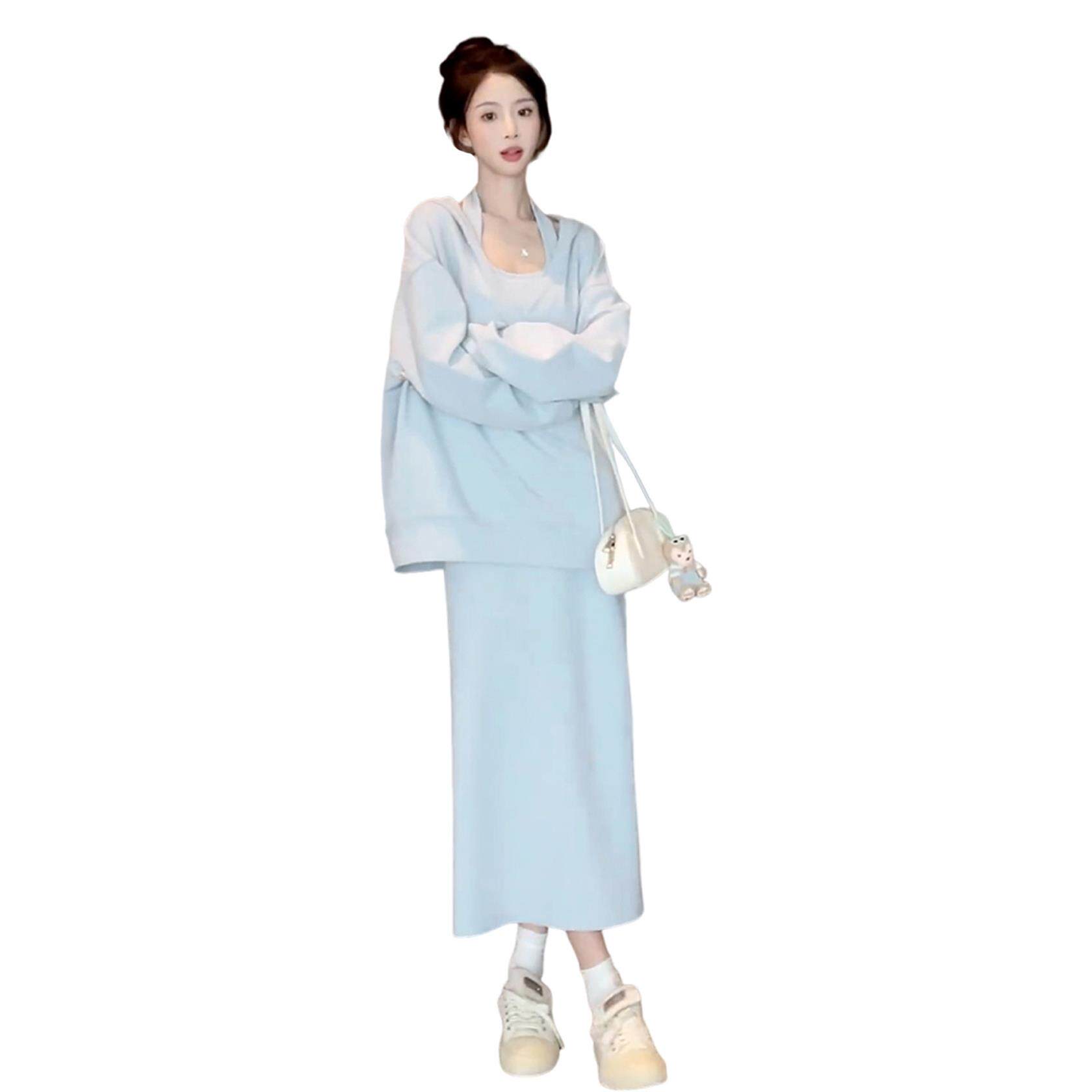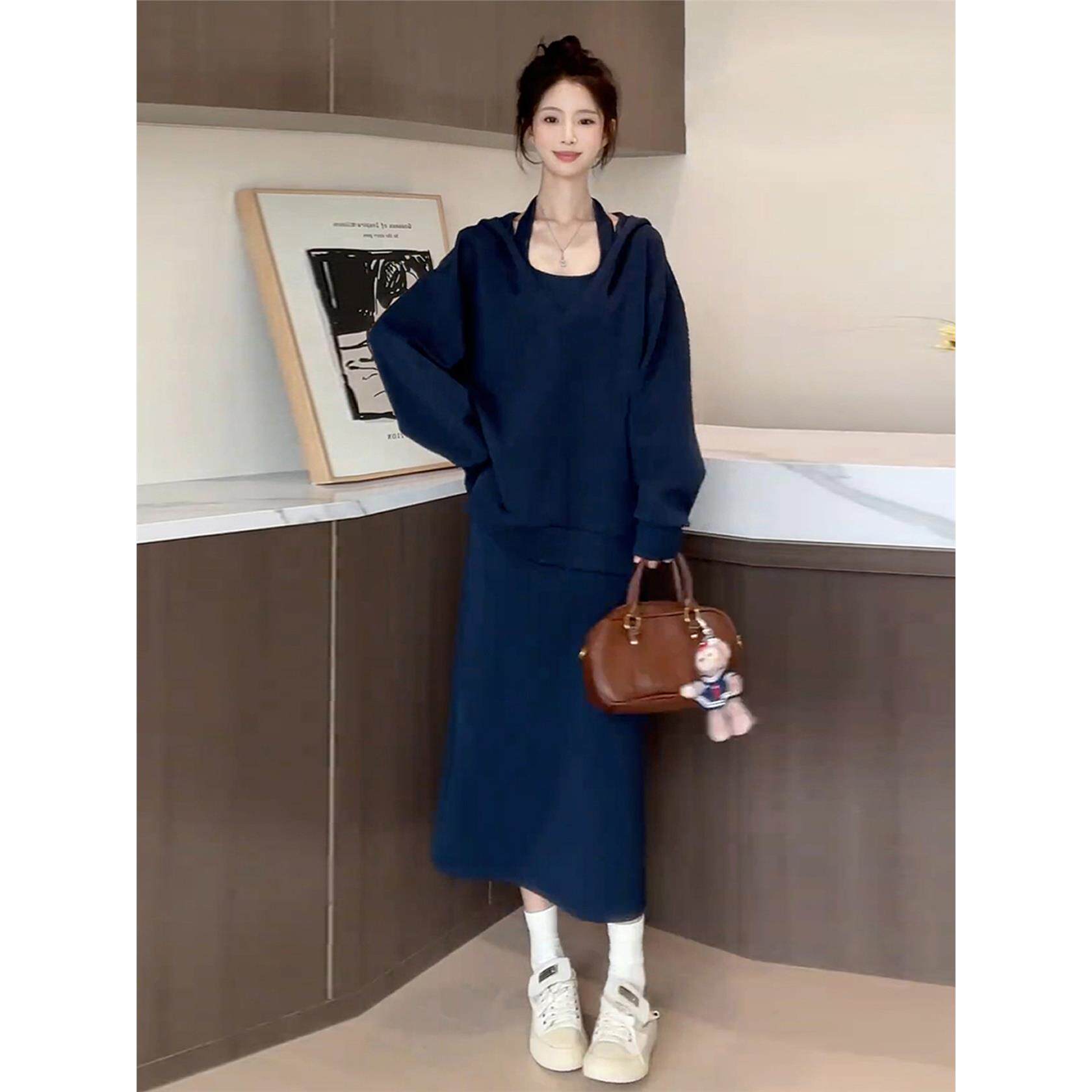 长裙 韩系慵懒穿搭卫衣套装 2025新款 蓝色挂脖吊带连衣裙子女早秋季