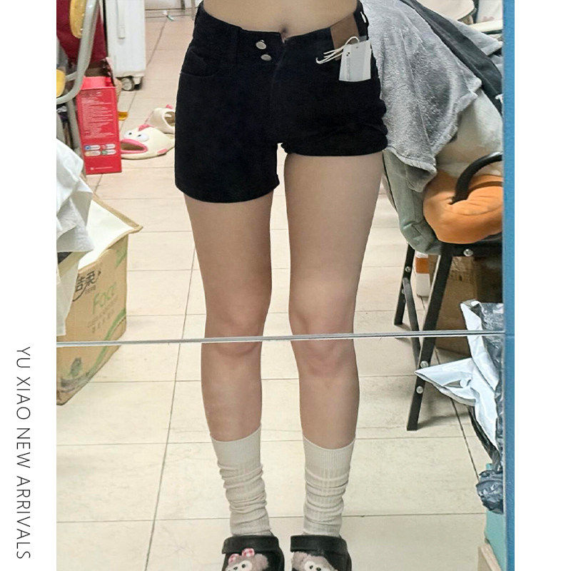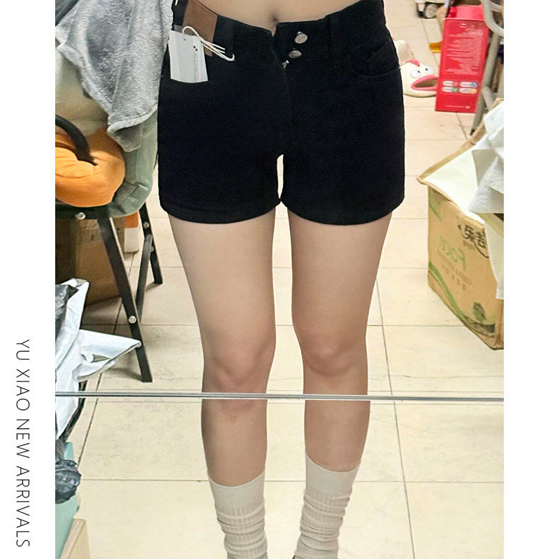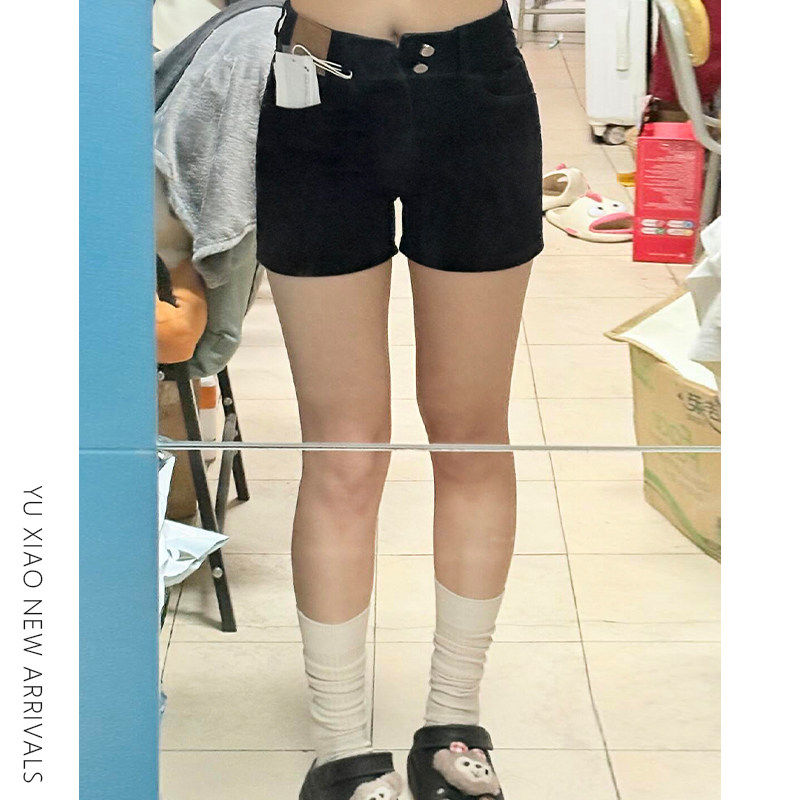 显瘦小个子弹力遮胯a字热 高腰胖mm大尺码 黑色藏肉牛仔短裤 女夏季
