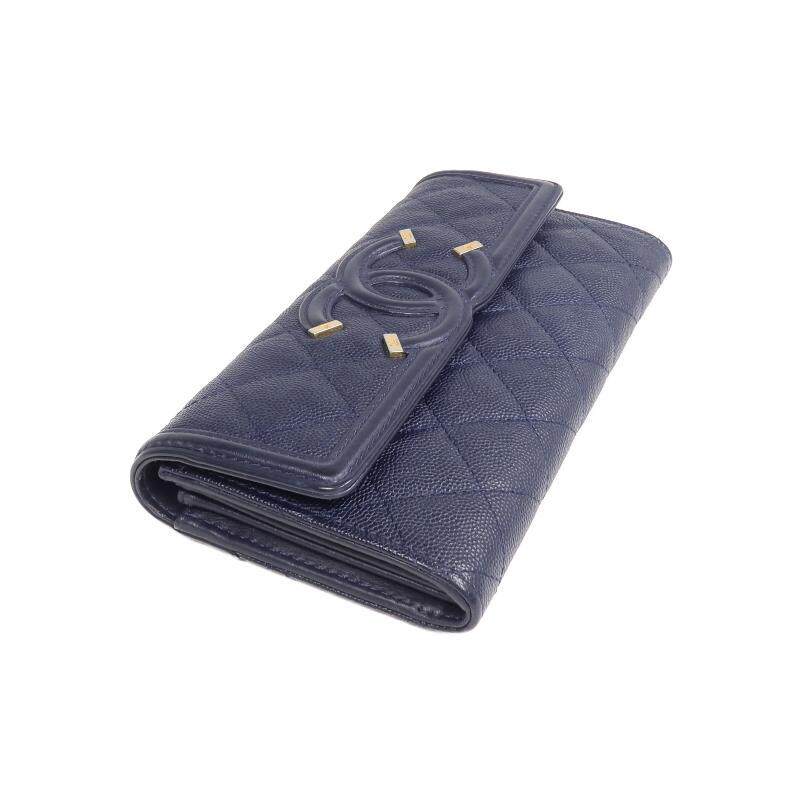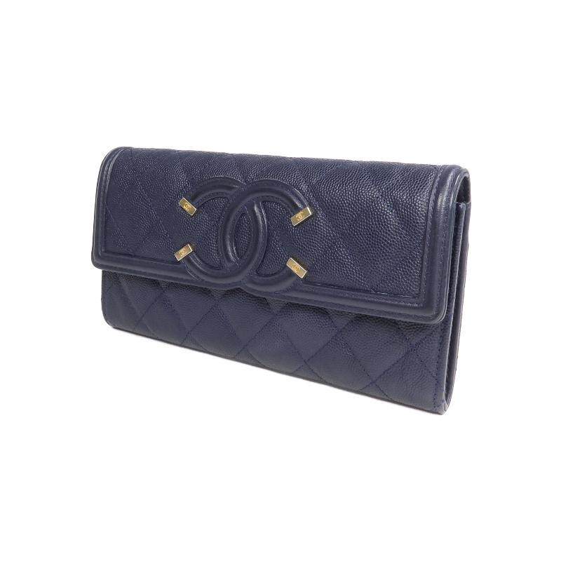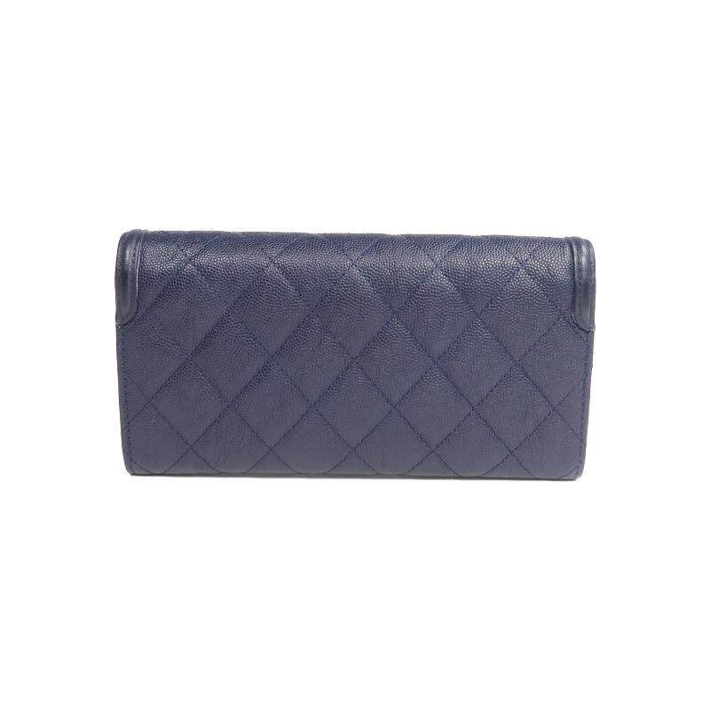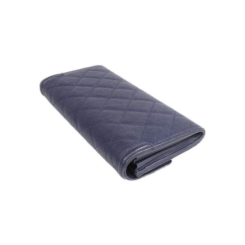 中古Chanel香奈儿女B级9新bi fold双折牛皮长钱包蓝色