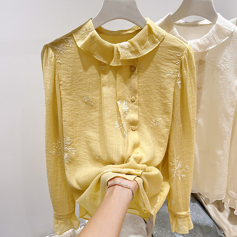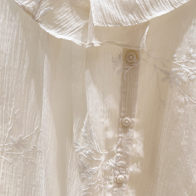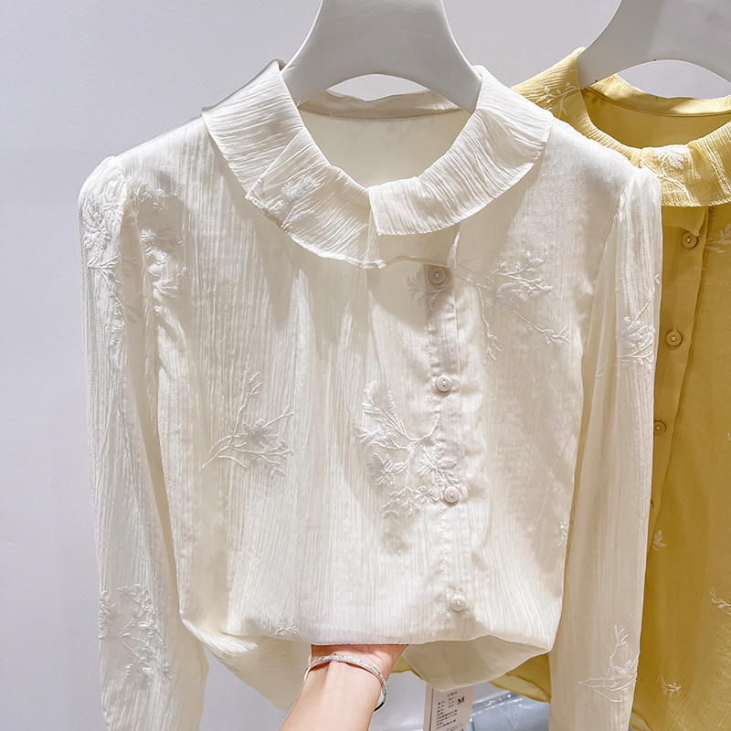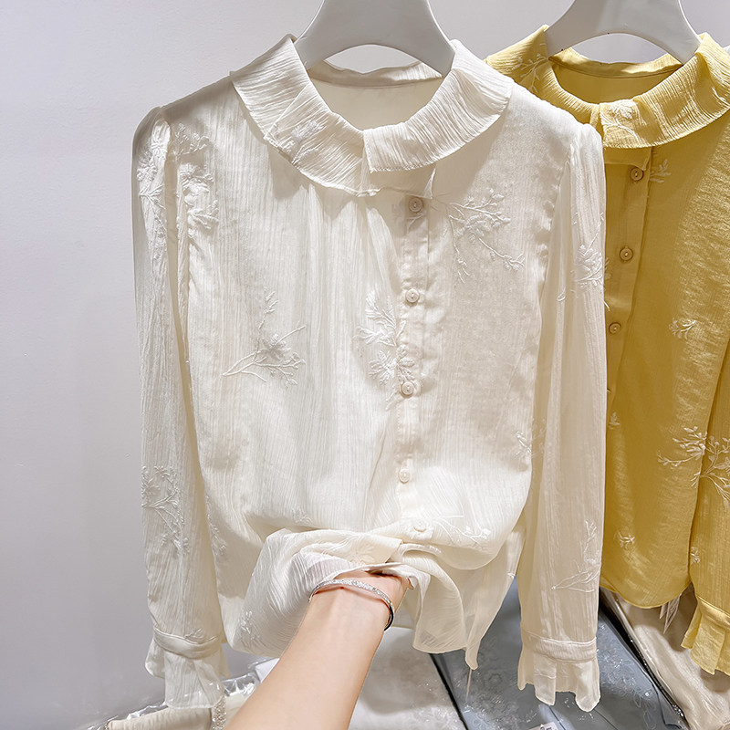 法式 薄款 气质娃娃领刺绣单排扣纯色长袖 女春季 上衣 衬衫 2026新款