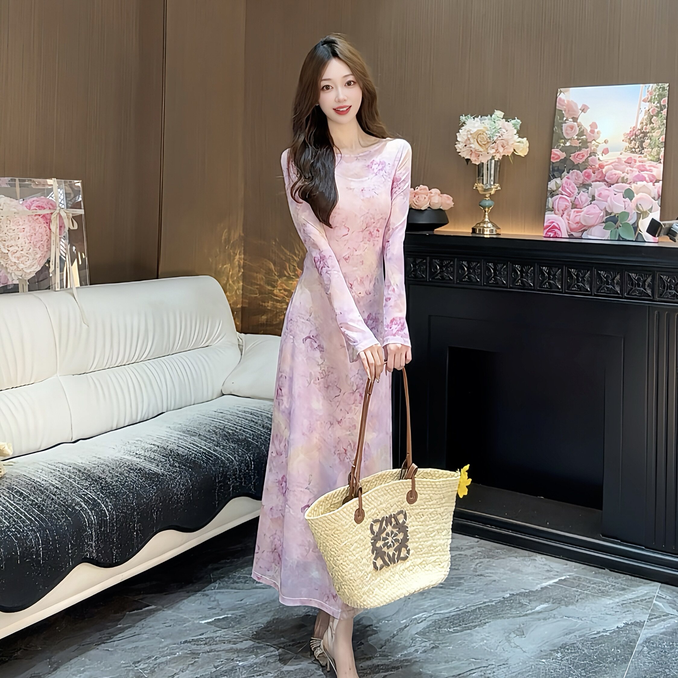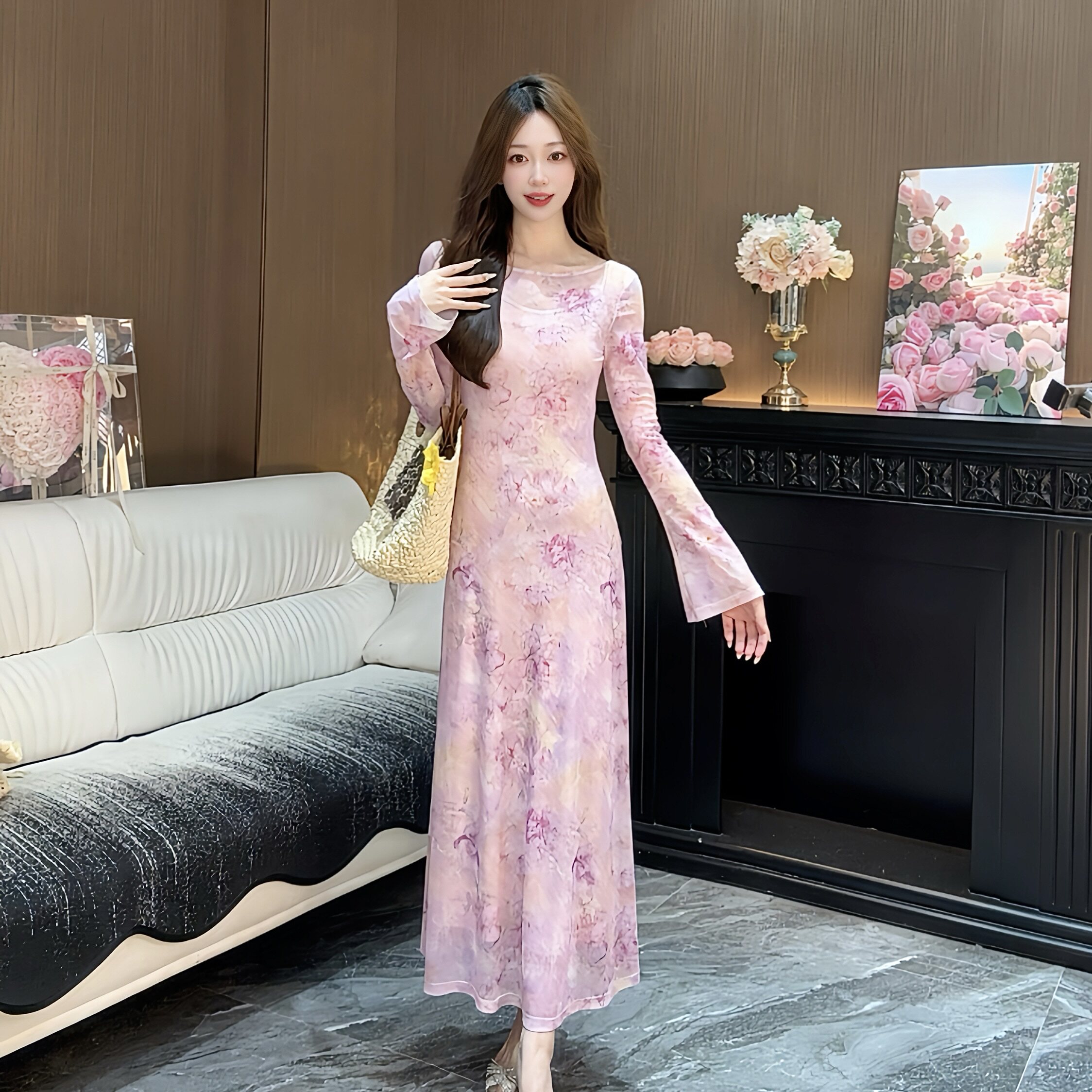 高弹力长裙印花修身 气质印花常规长款 连衣裙碎花418 长袖 2026春季