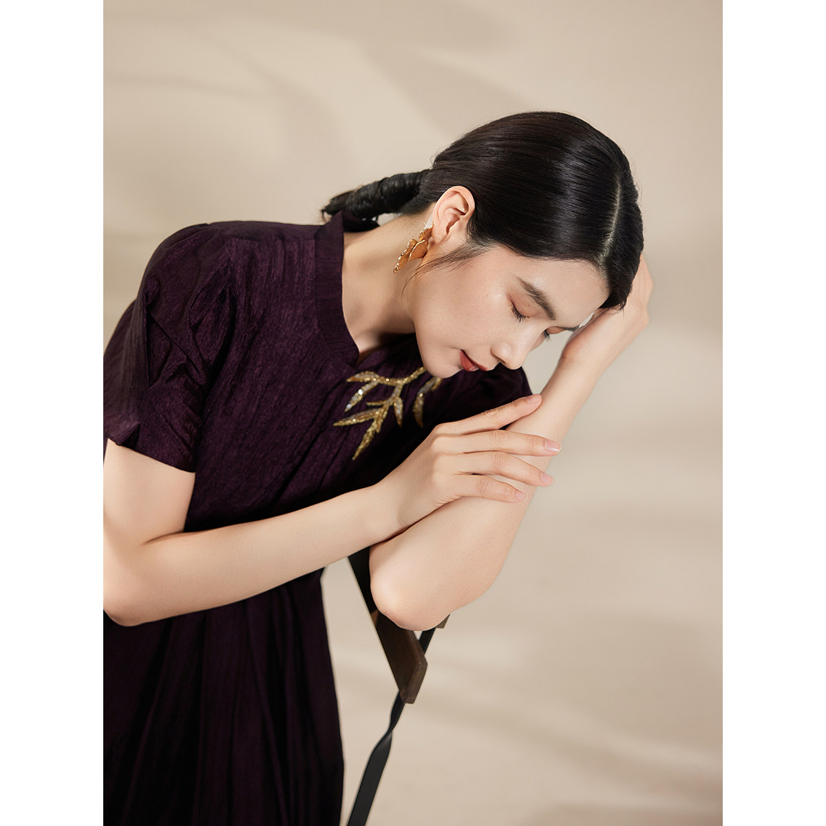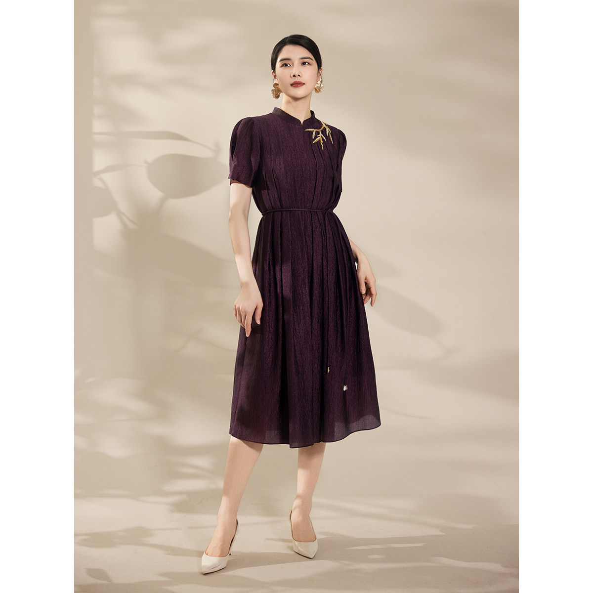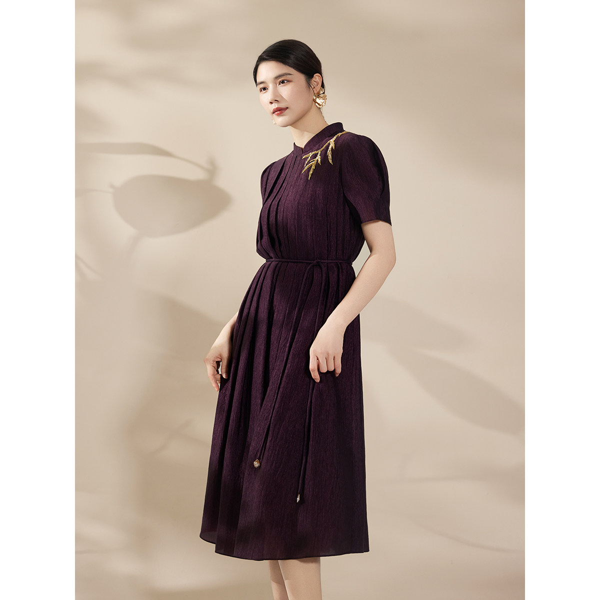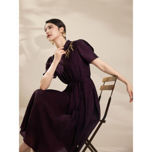 东方立领醋酸褶皱刺绣短袖 新款 连衣裙 粉蓝衣橱2026夏装 BBLLUUEE