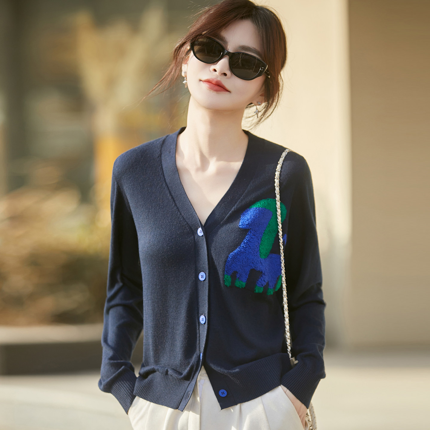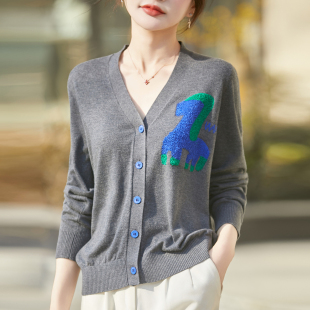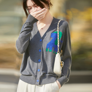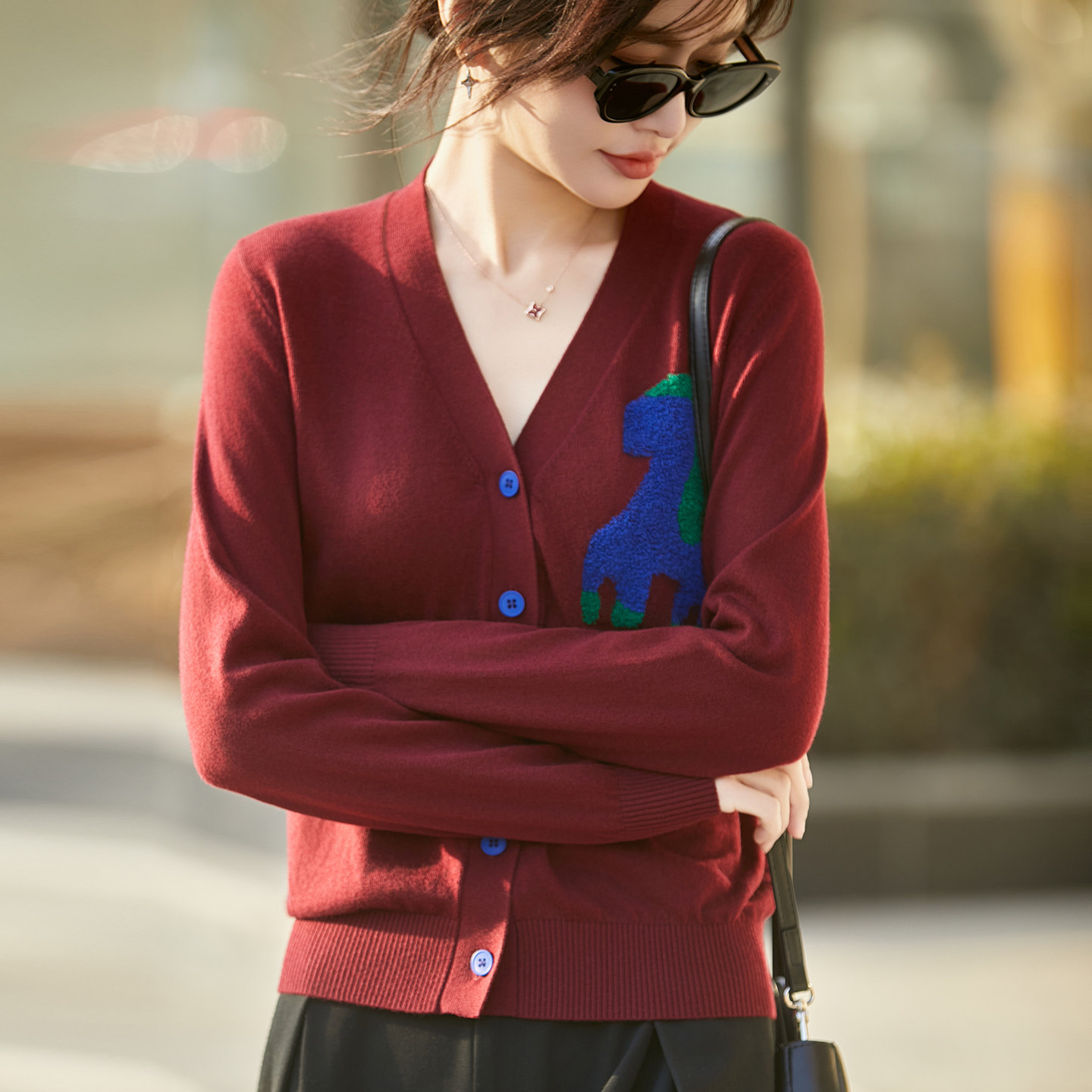 V领拼色精纺羊毛开衫 女26春秋小马刺绣提花针织毛衣拼色宽松外套