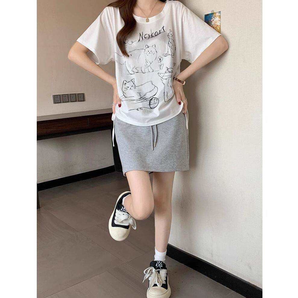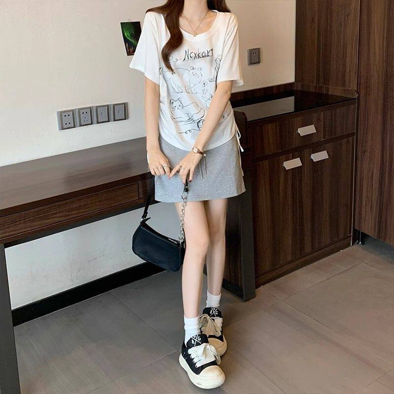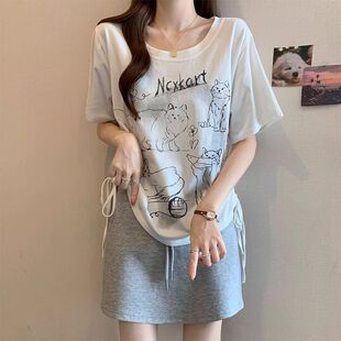 收腰显瘦可爱抽绳遮肉正肩上衣 T恤女夏2025新款 大码 减龄抽褶短袖
