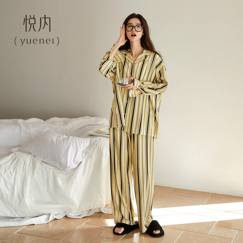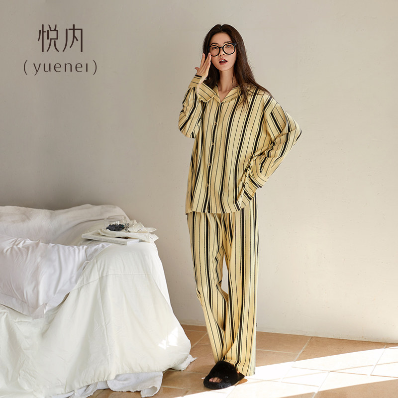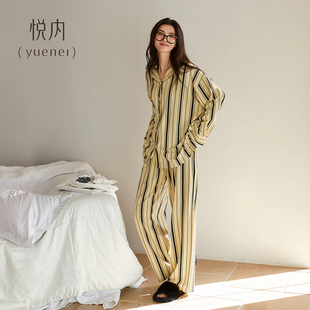 秋款 条纹开衫 纯棉长袖 家居服宽松大码 可外穿 长裤 悦内睡衣女春秋季