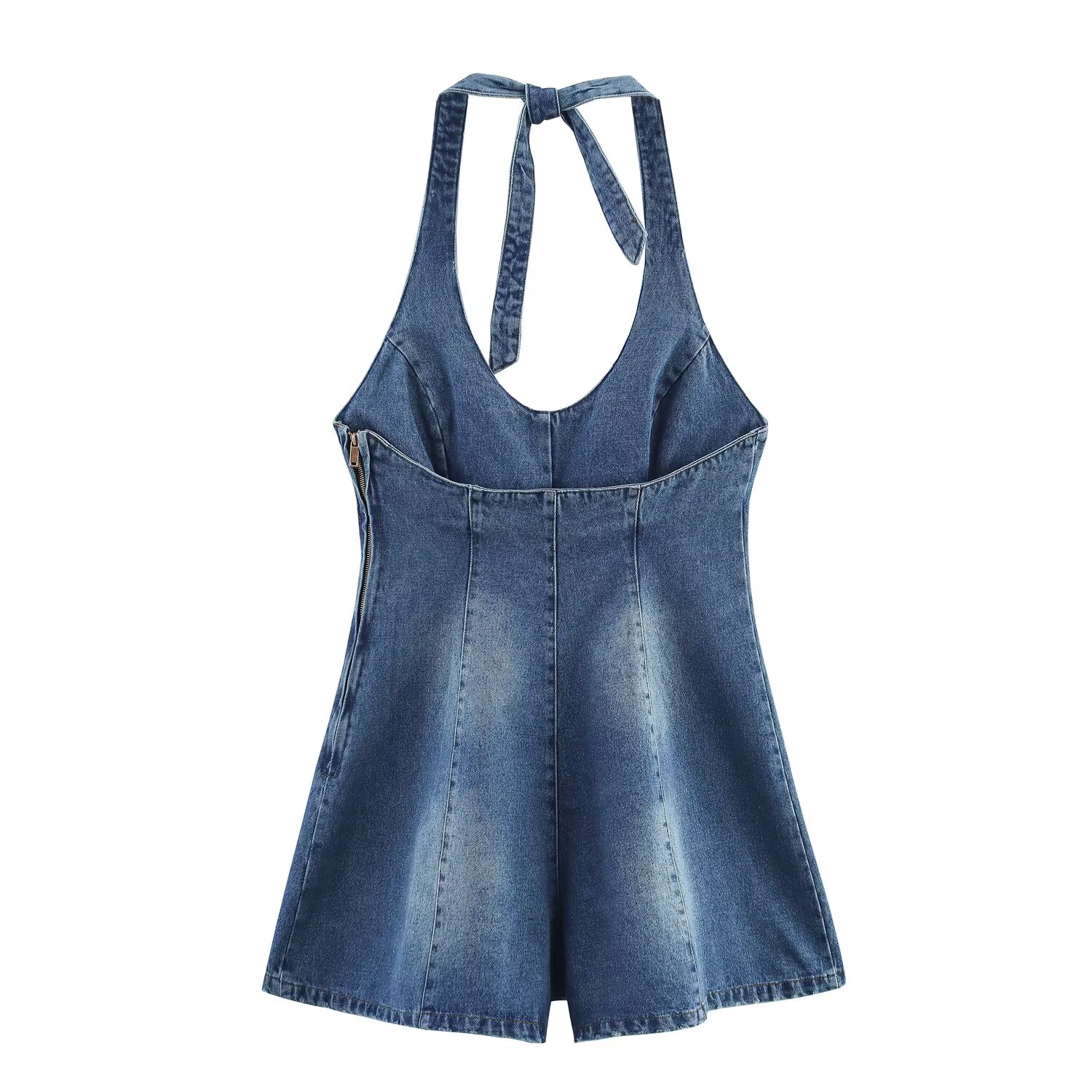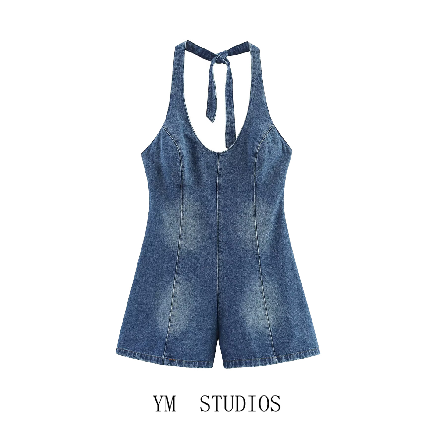 女夏季 复古挂脖领露美背牛仔连体裤 美式 少女减龄显瘦短裤 包邮