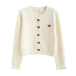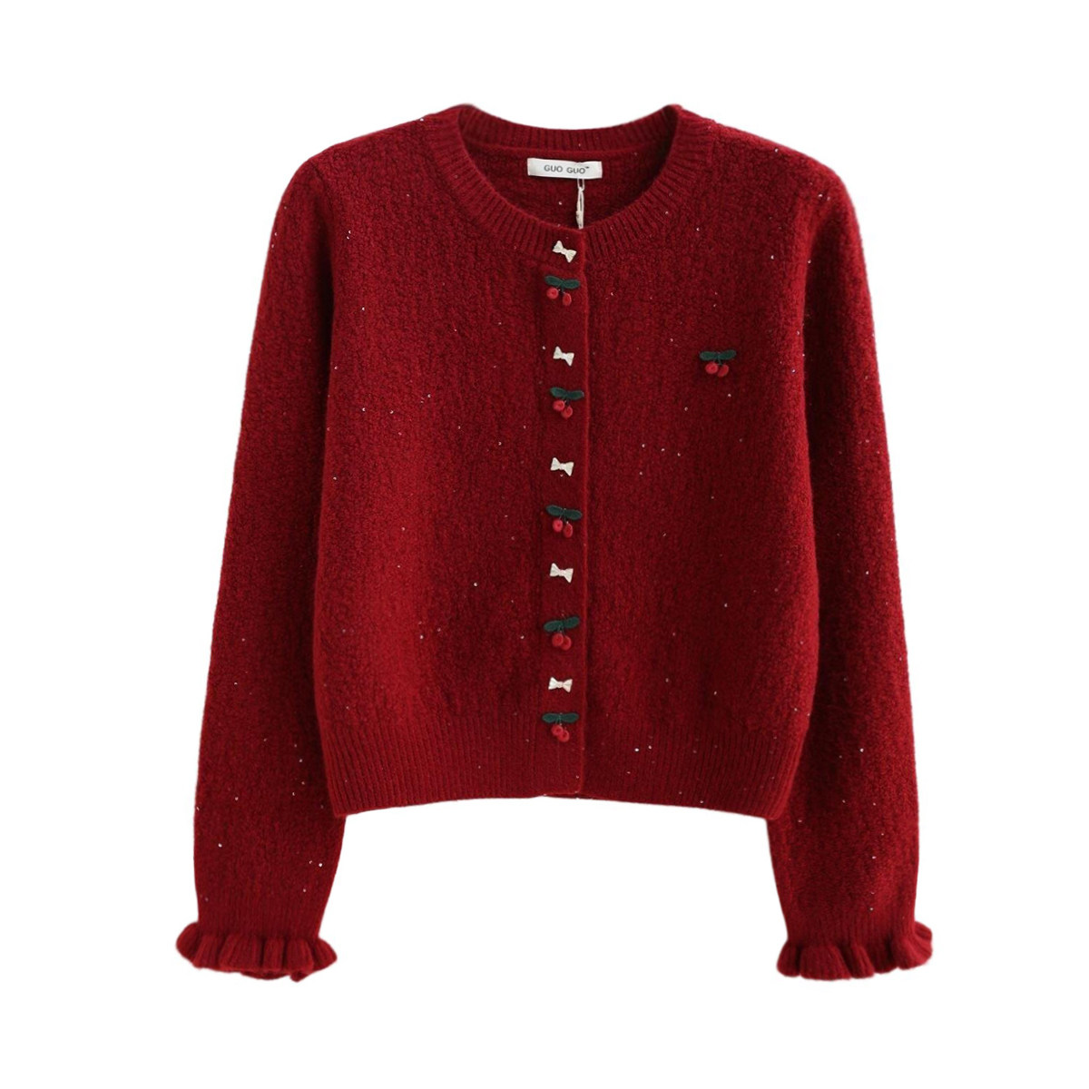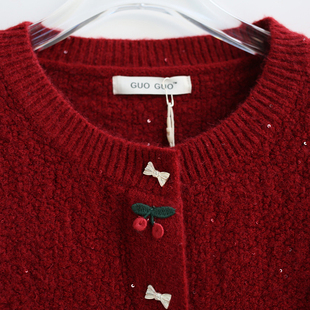 冬装 圆领毛衣开衫 新款 亮片蝴蝶结扣樱桃长袖 外套 新年短款 拾野森