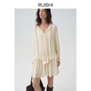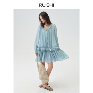 RUISHI芮时 花朵系带宽松度假风荷叶边连衣裙子女夏 云絮柔漾
