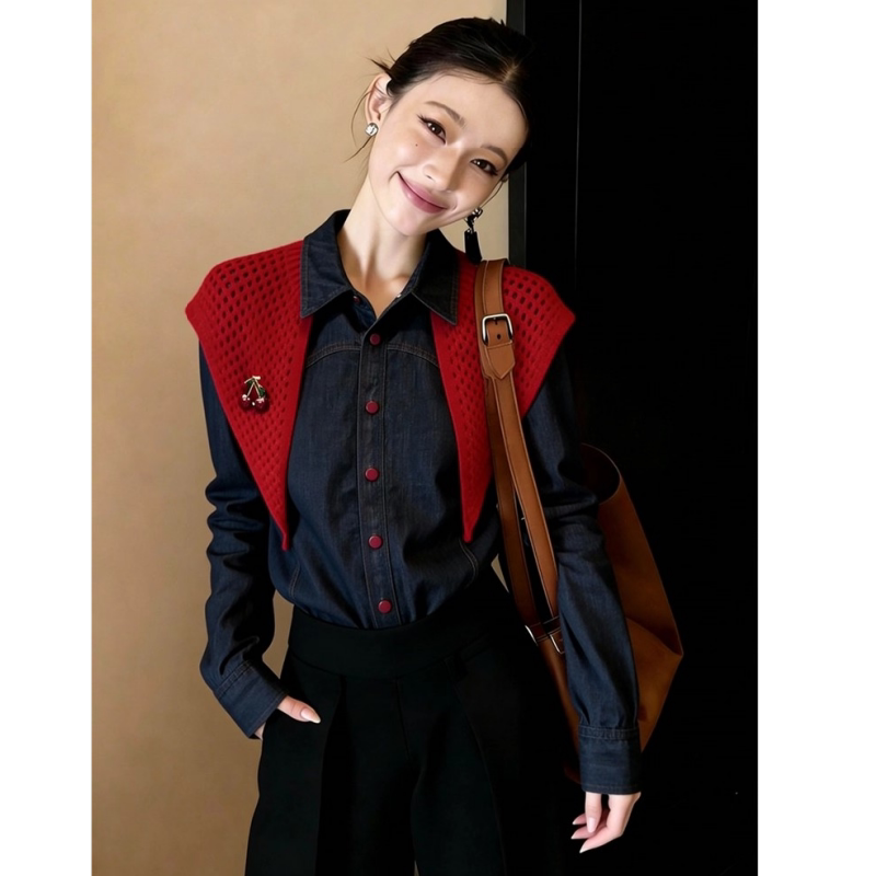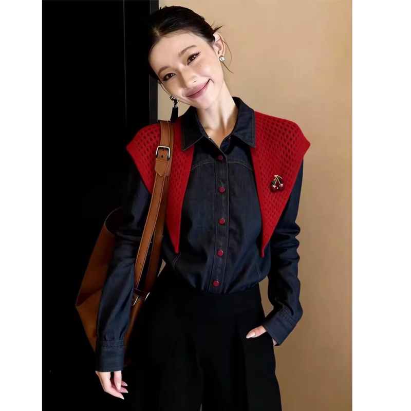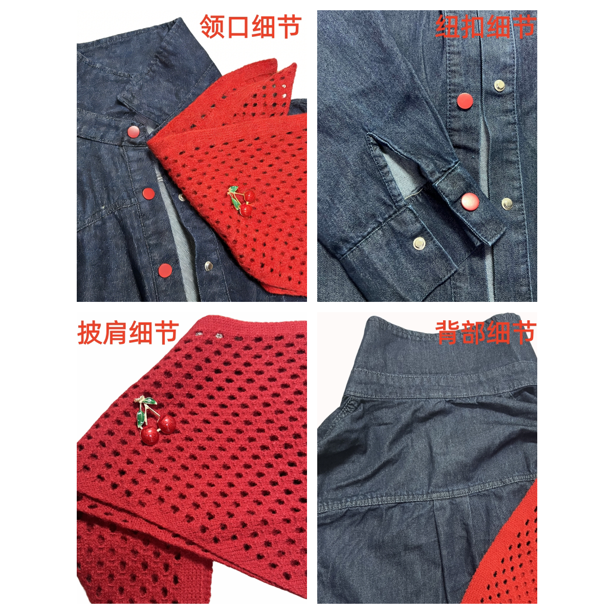 复古水洗牛仔衬衫 樱桃披肩设计感显瘦通勤日常简约两件套 女春秋季