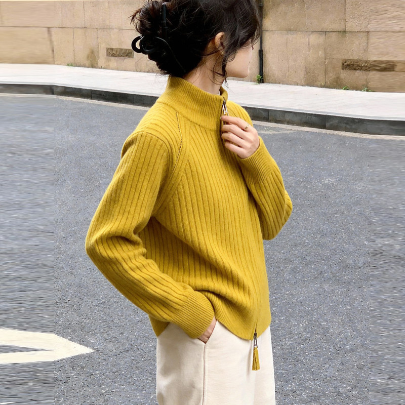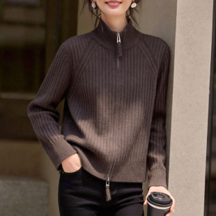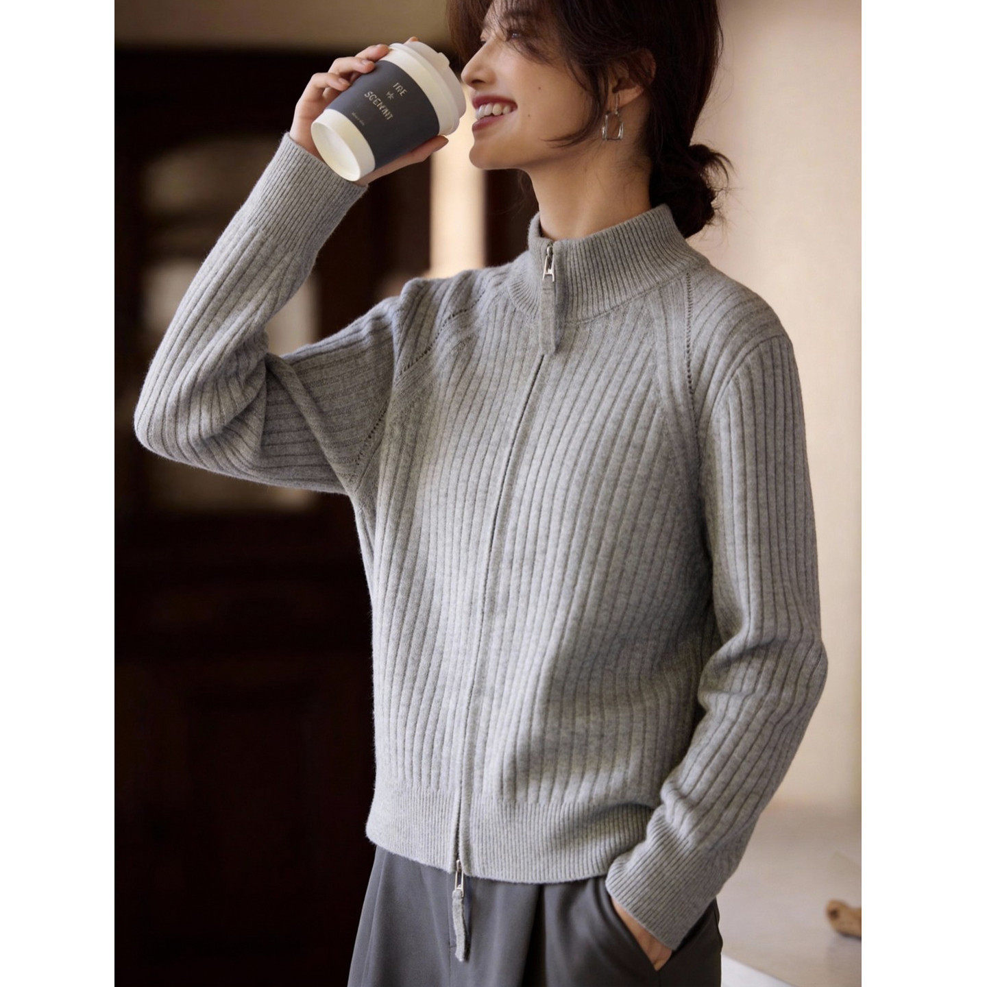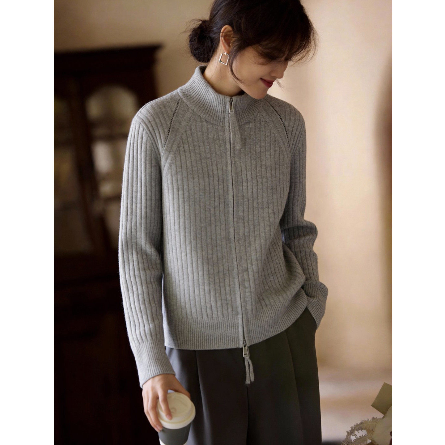 女新款 百家好半高领拉链羊毛衫 拉链针织灰色毛衣外套 House Basic