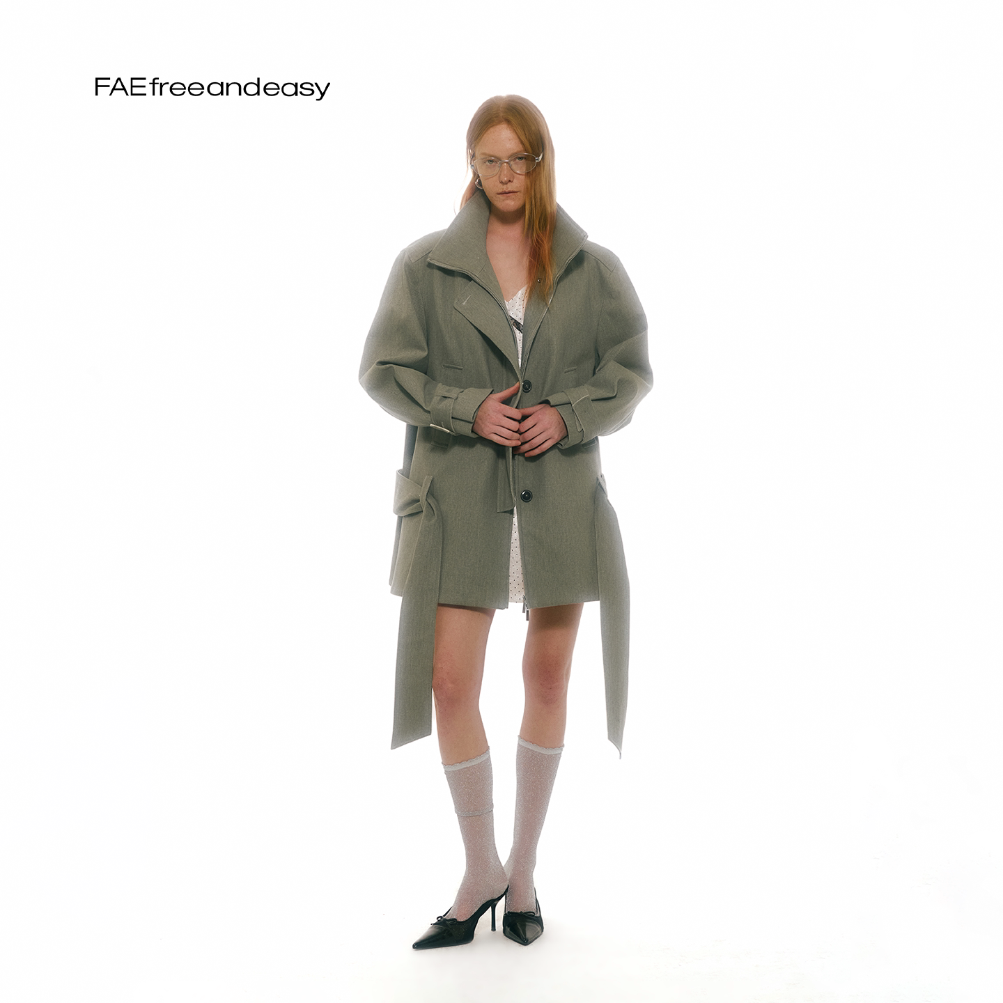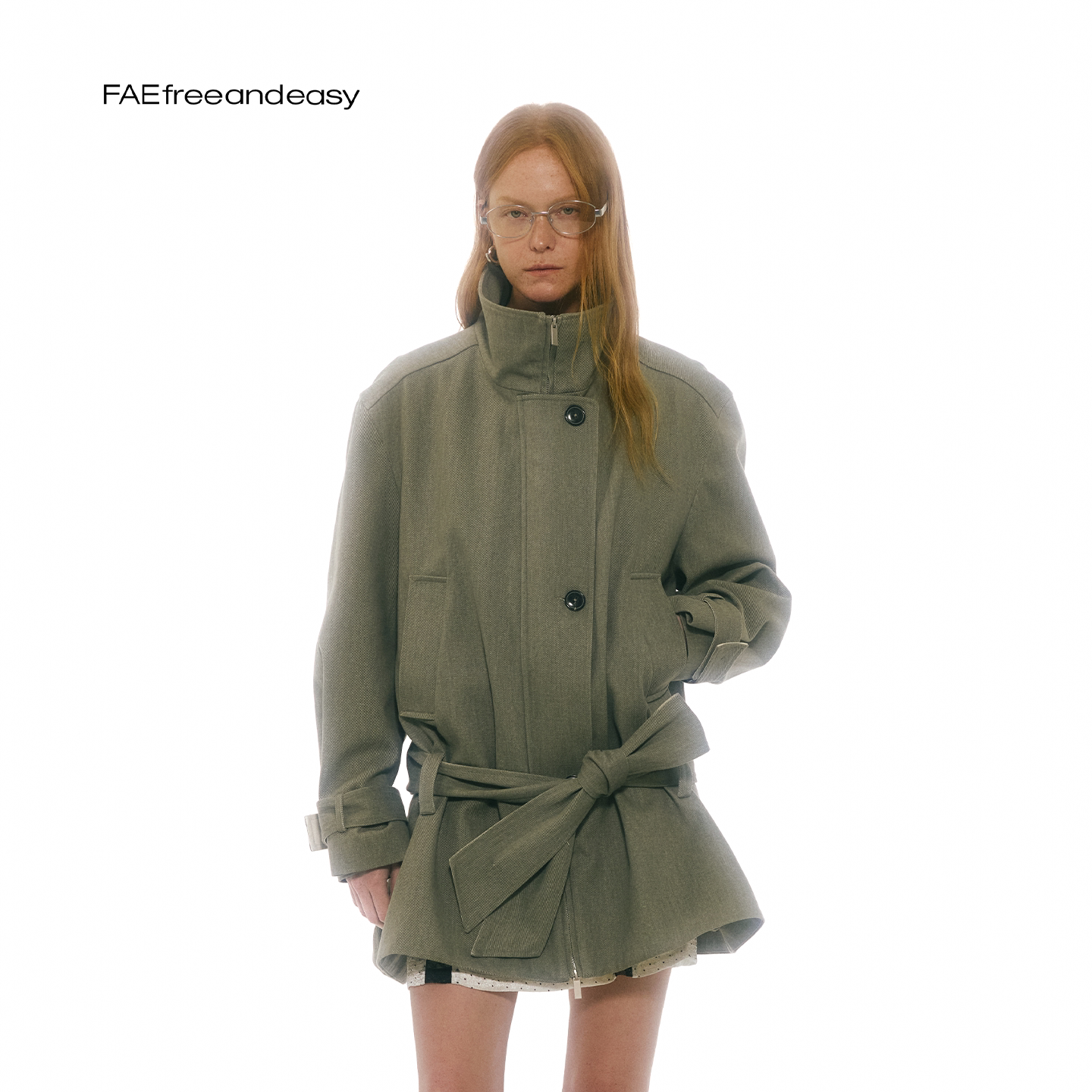 英伦风系带收腰廓形立领灰绿色风衣早春外套女 角落花园 FAE
