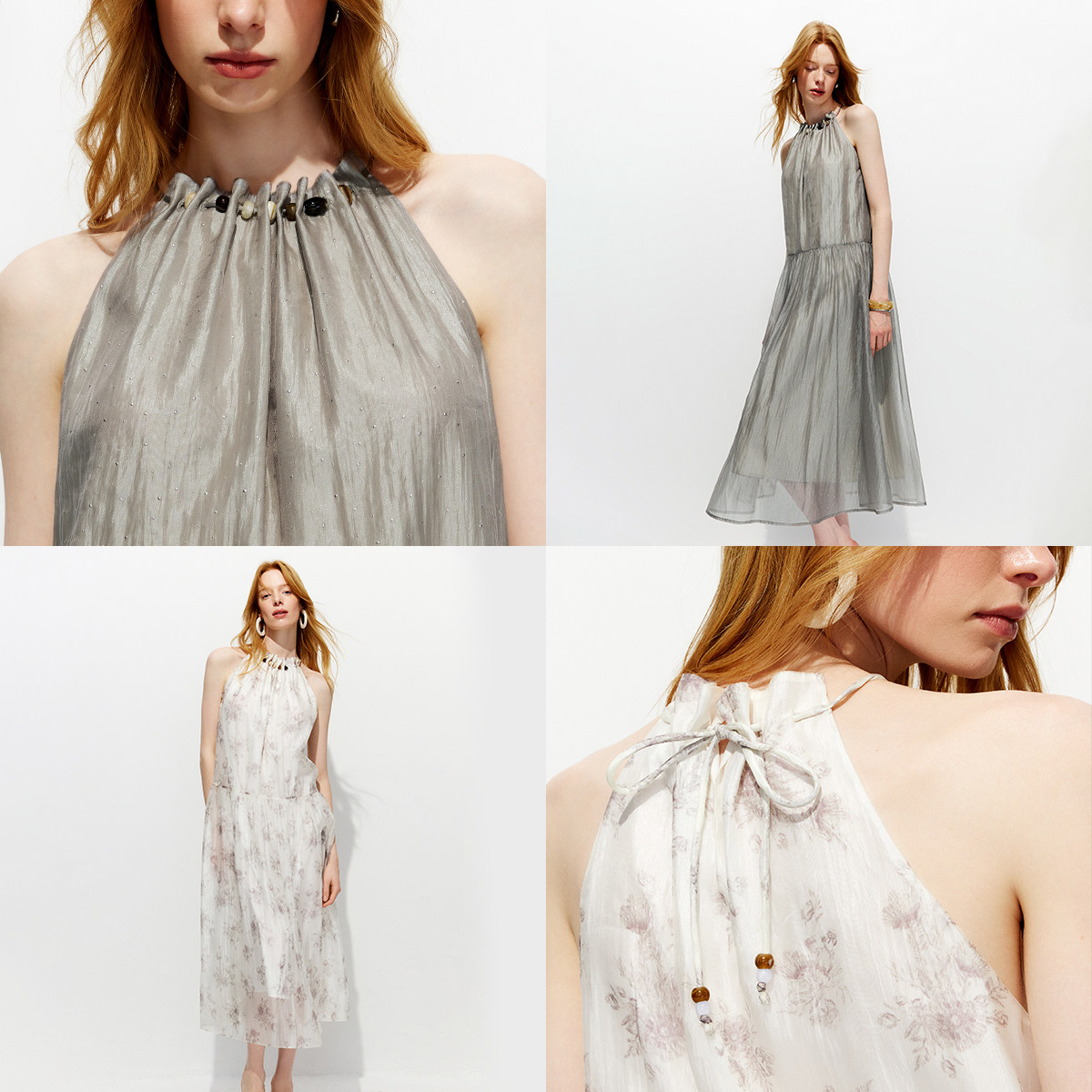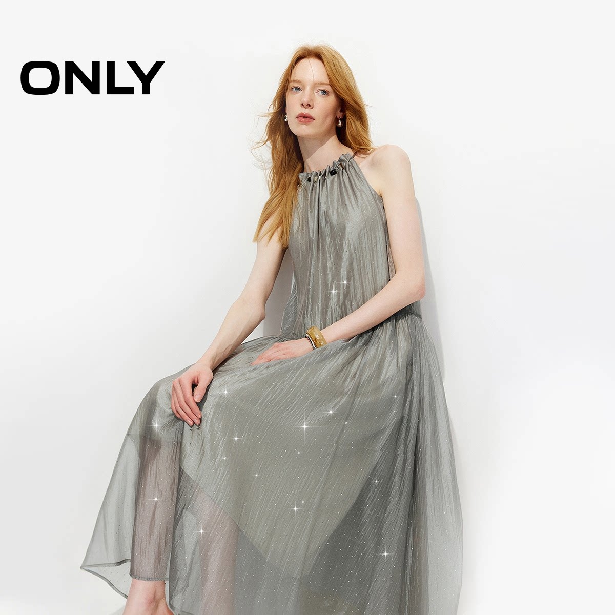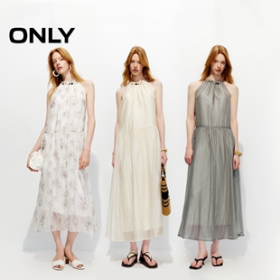 ONLY2026春季 淡人H型裙子串珠挂脖细闪烫钻压褶摆纱长连衣裙 新款