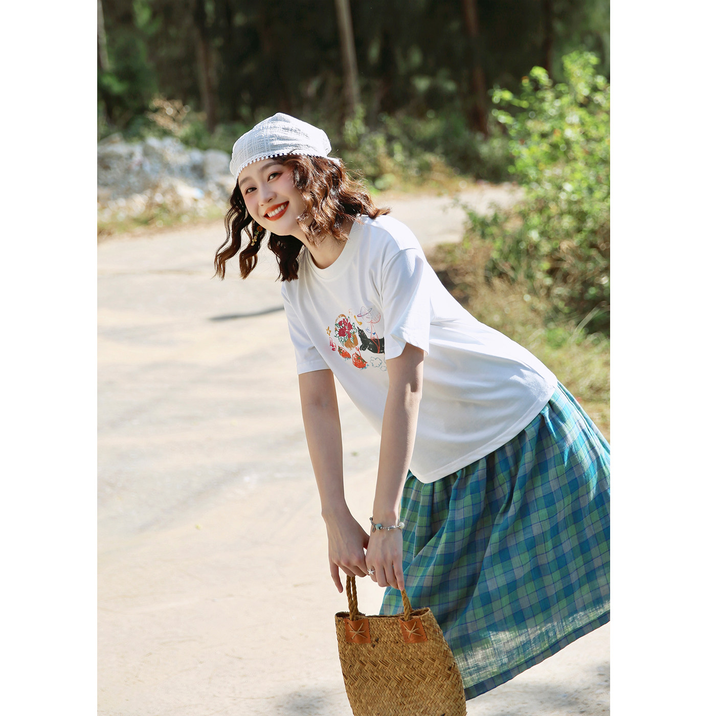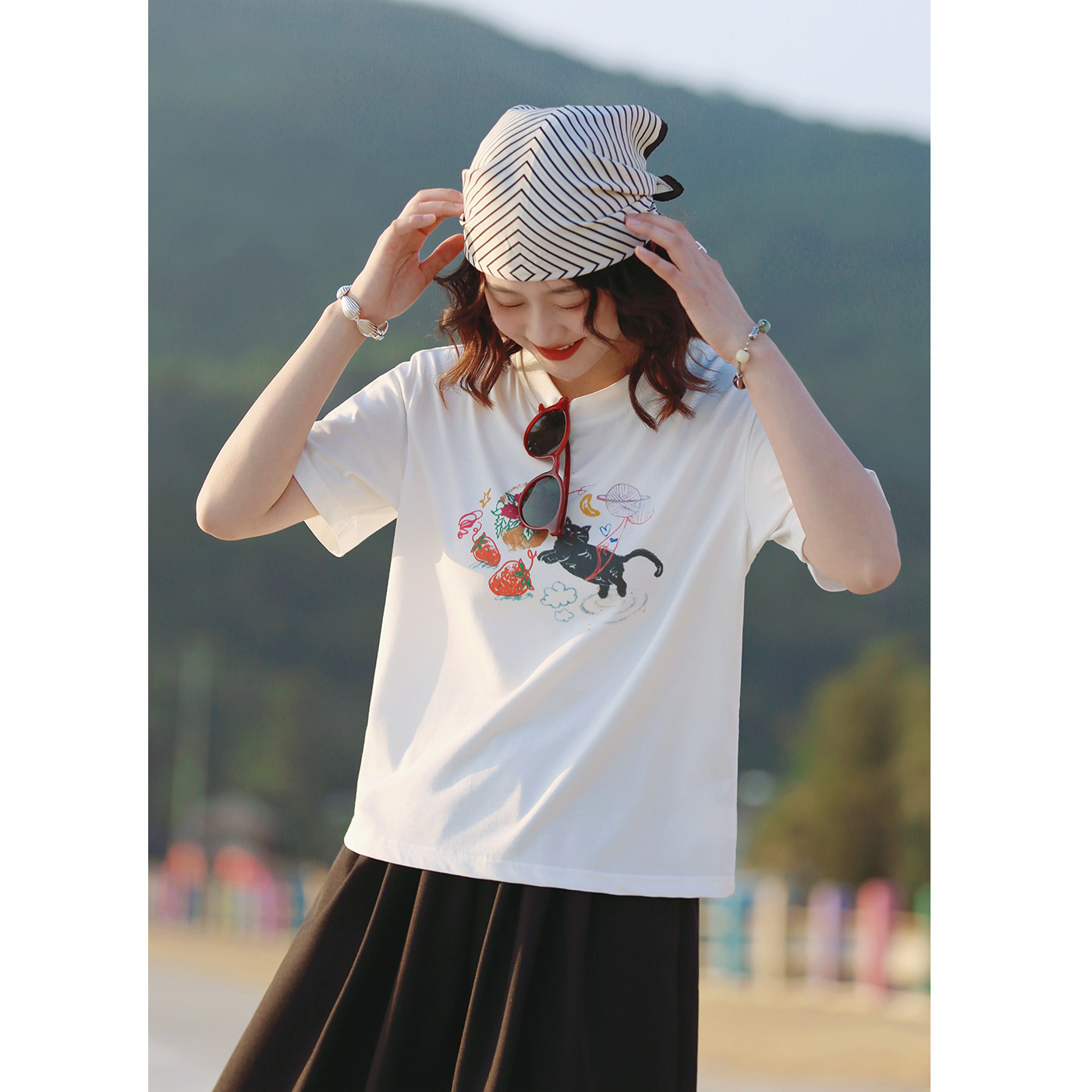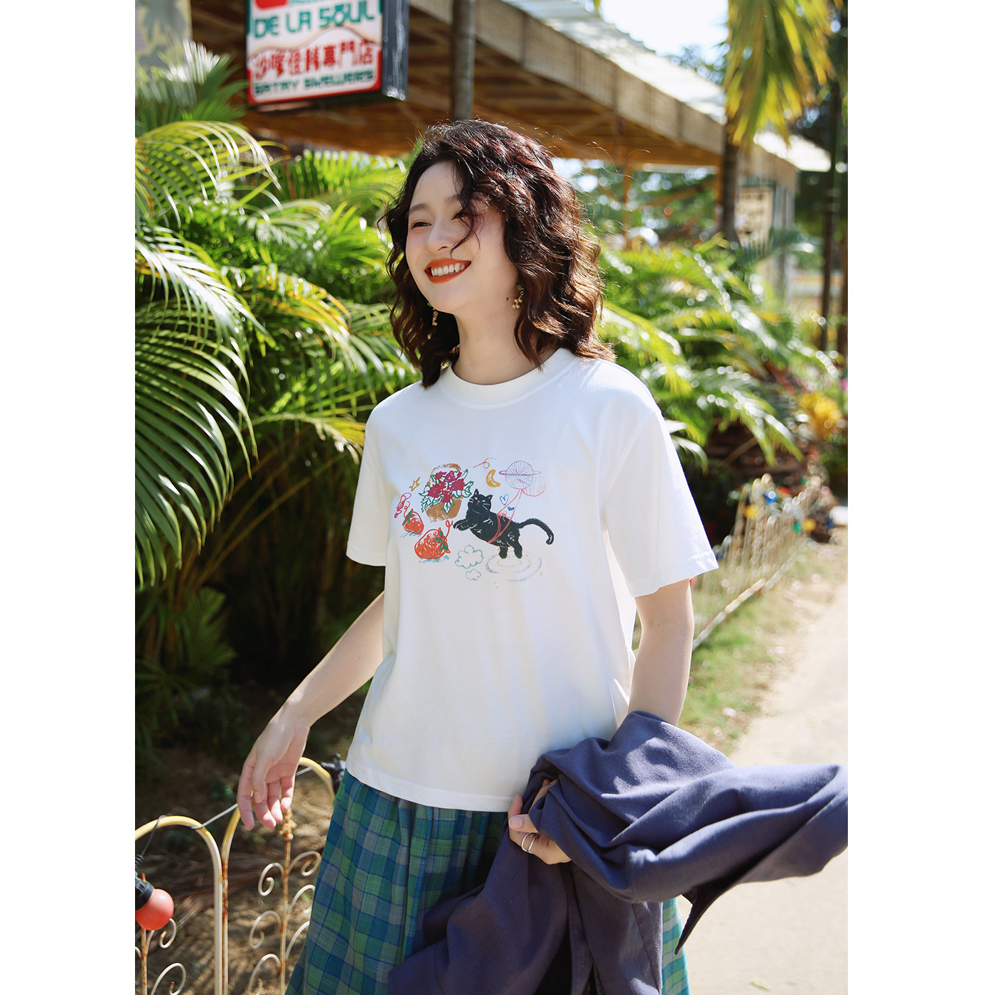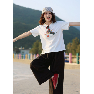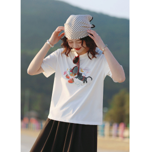 花吉C146白色圆领猫咪印花宽松短袖 春甜美休闲上衣 T恤女2026新款