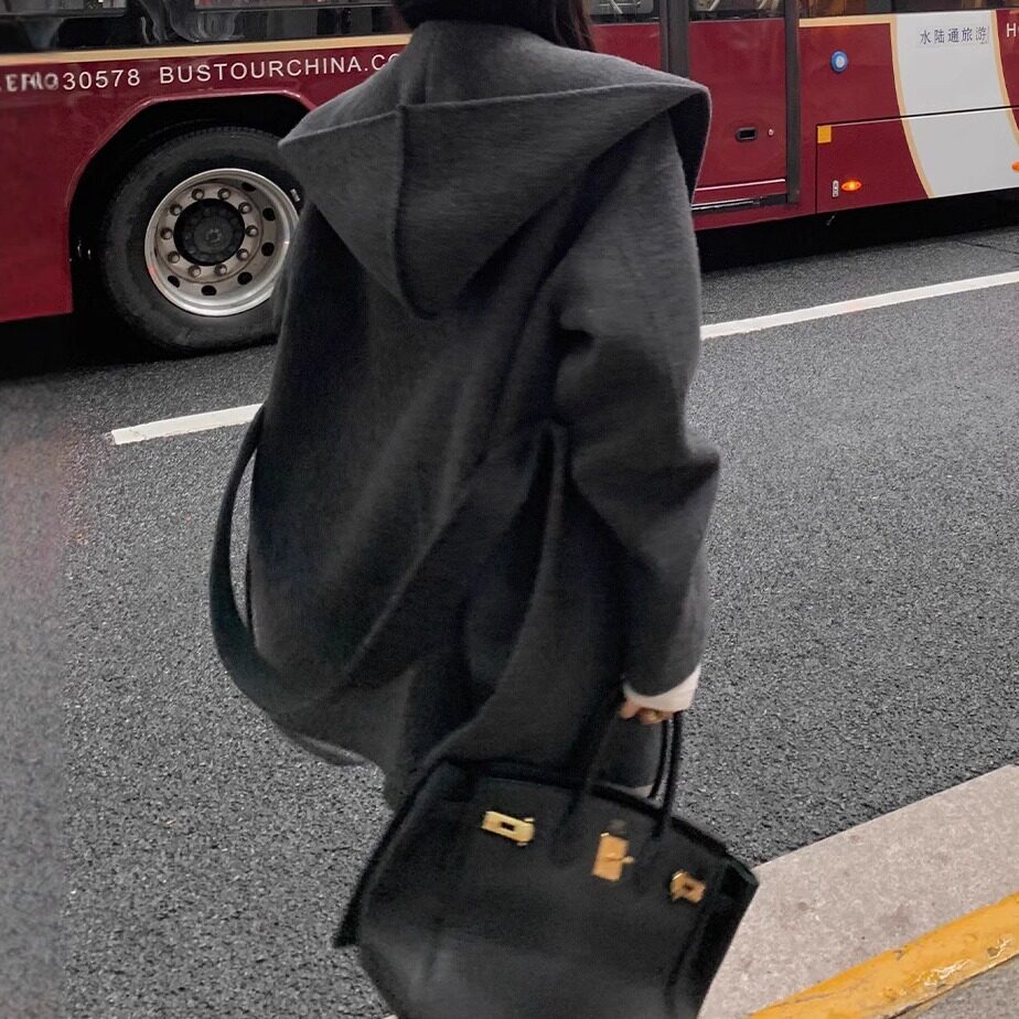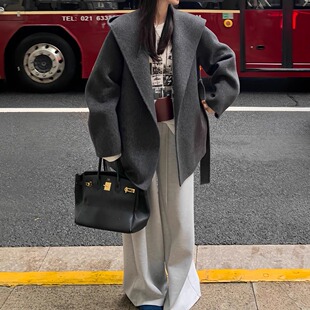 呢子宽松连帽毛呢外套 小个子短款 高级感羊毛双面呢大衣女韩版 冬季