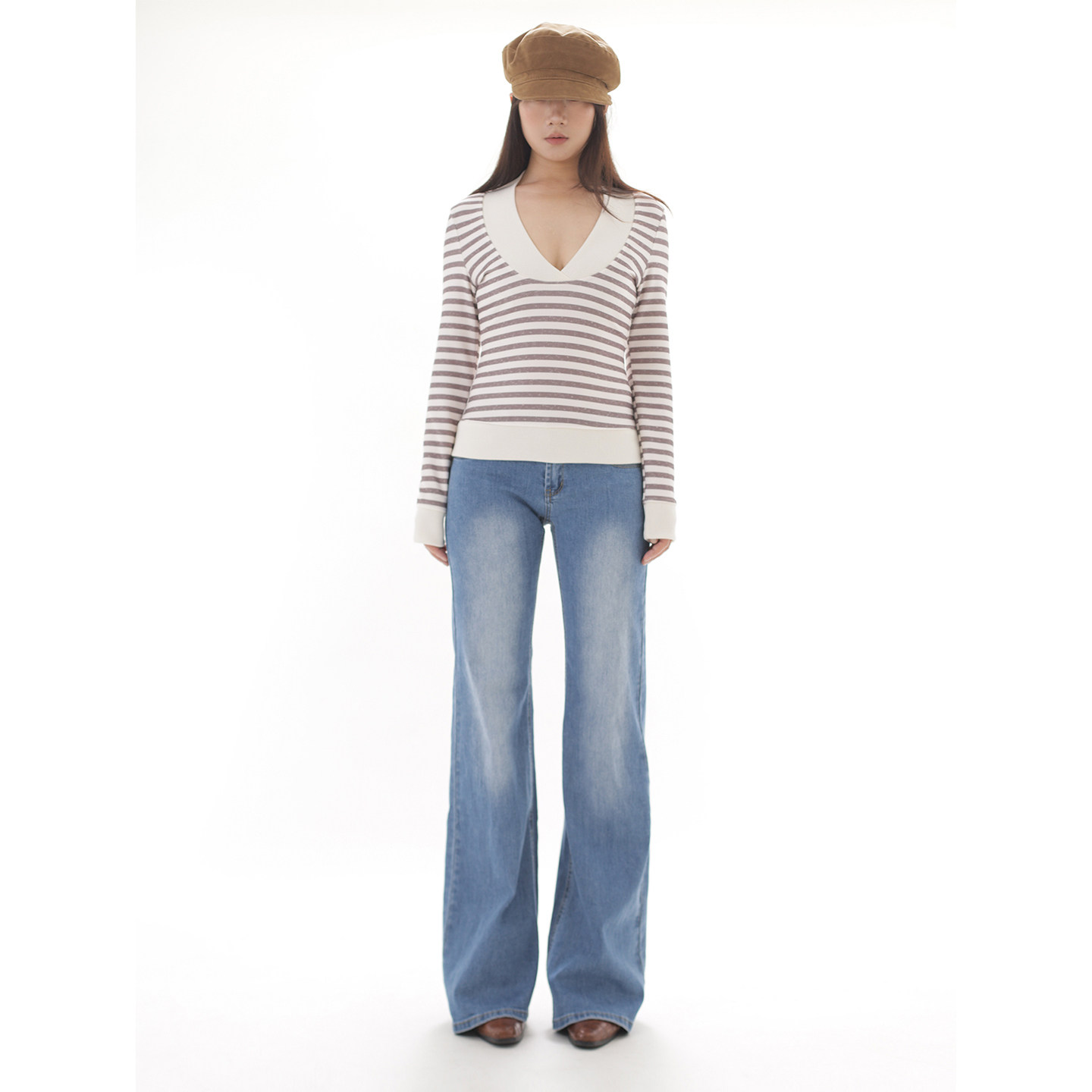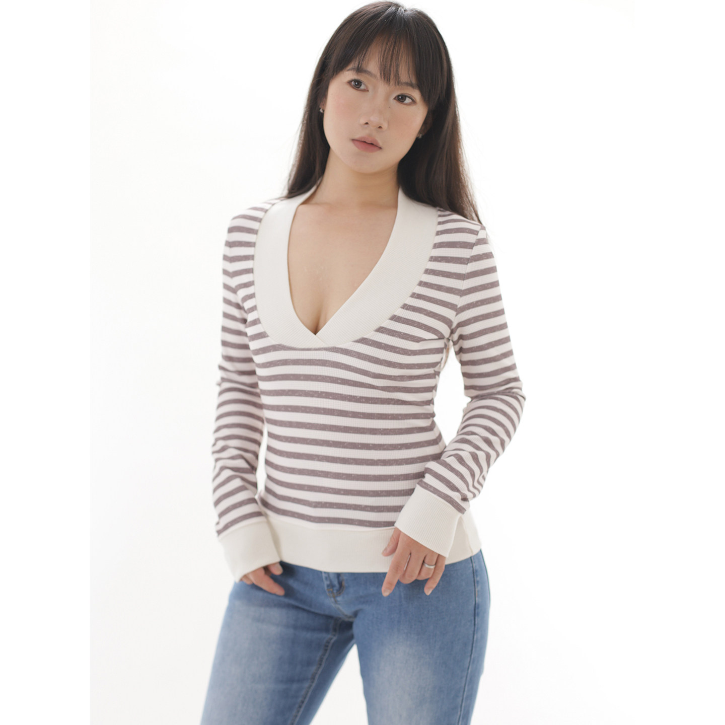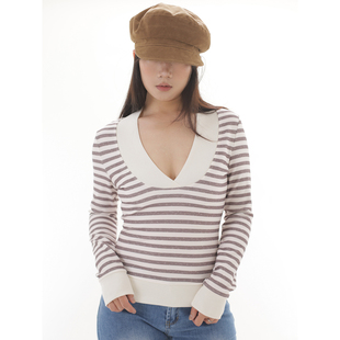 打底衫 ohmyloli 修身 复古交叠深v领华夫格条纹印花长袖 美式