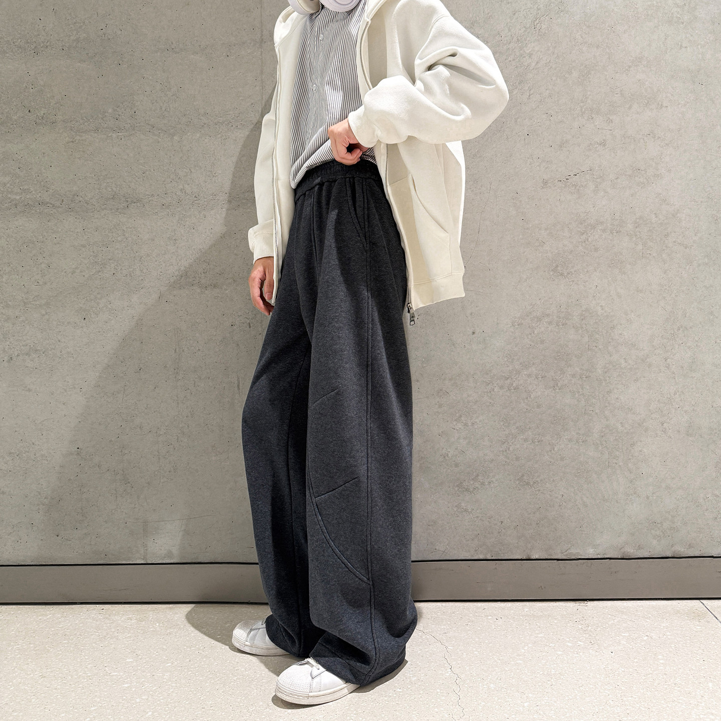 胖mm梨型身材慵懒加厚运动卫裤 女冬季 白色高腰显瘦加绒阔腿裤 大码