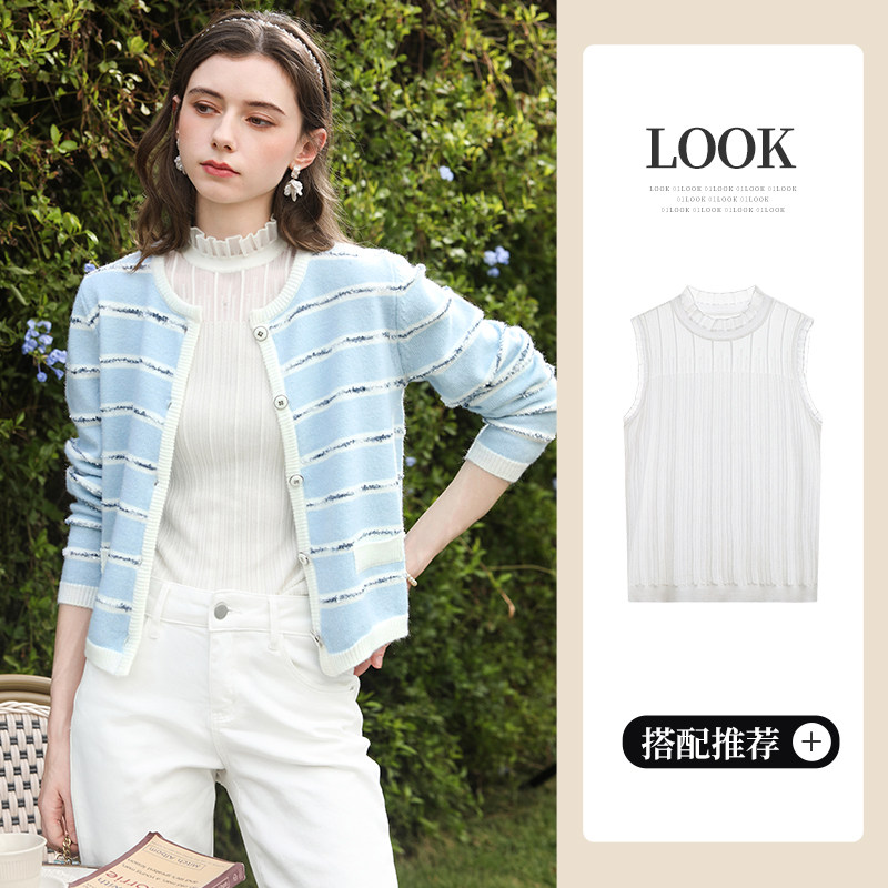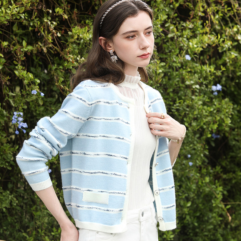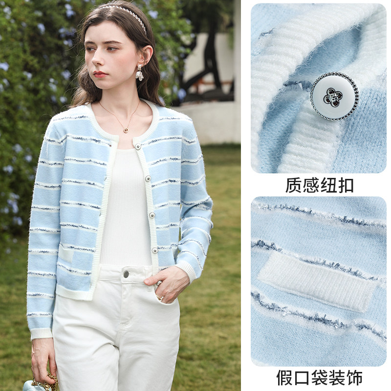 外套 毛衣女2026春秋新款 艾蓓怡蓝色法式 小香风条纹提花针织开衫