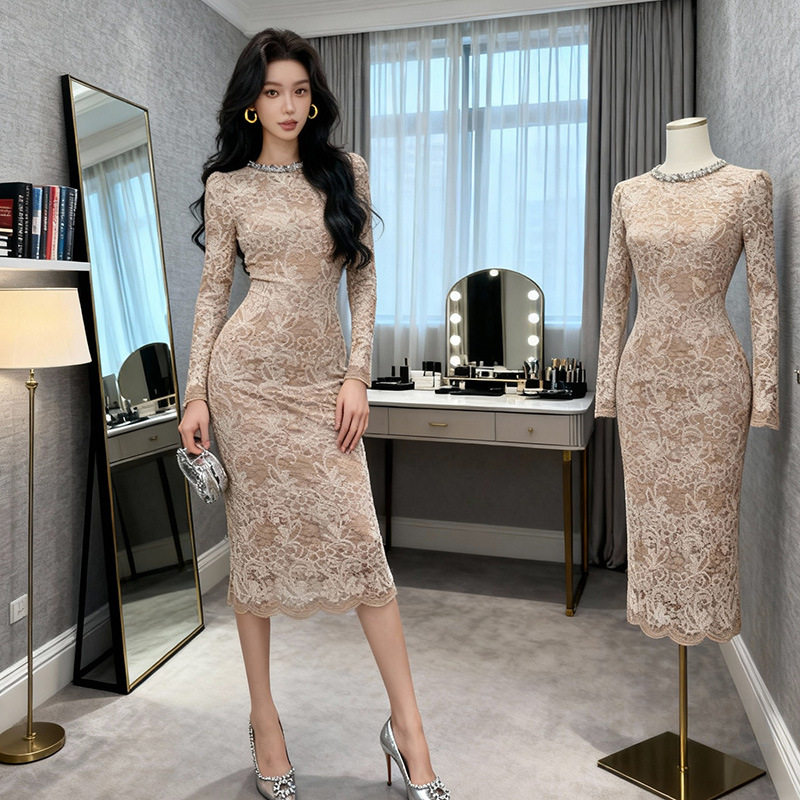 蕾丝连衣裙女2025秋冬新款 包臀裙 圆领收腰显瘦名媛风礼服裙长款