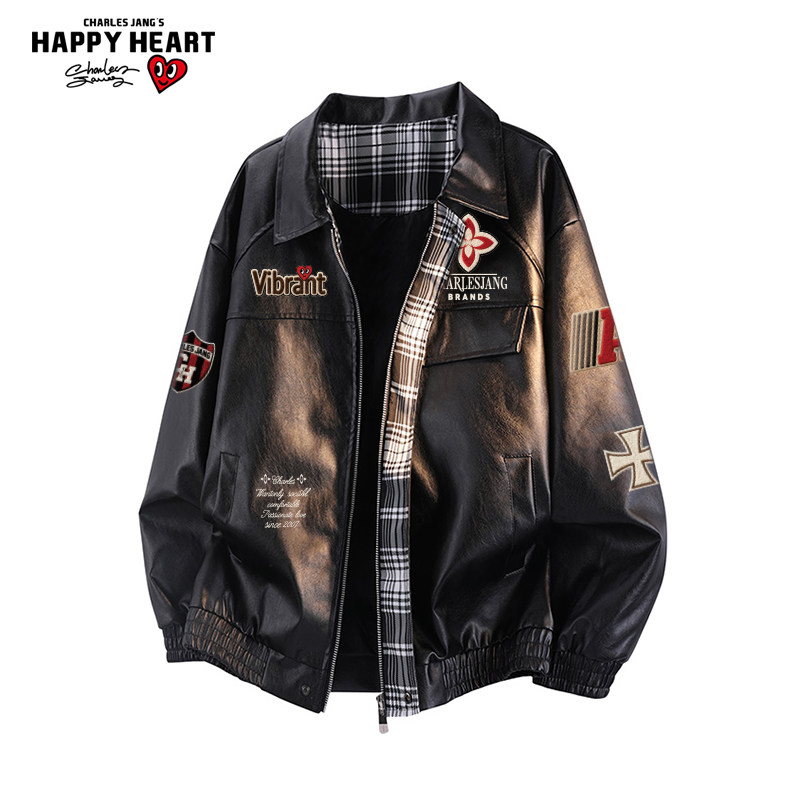 查尔斯桃心复古印花PU皮夹克男士 潮流百搭机车服上衣外套 春秋冬季